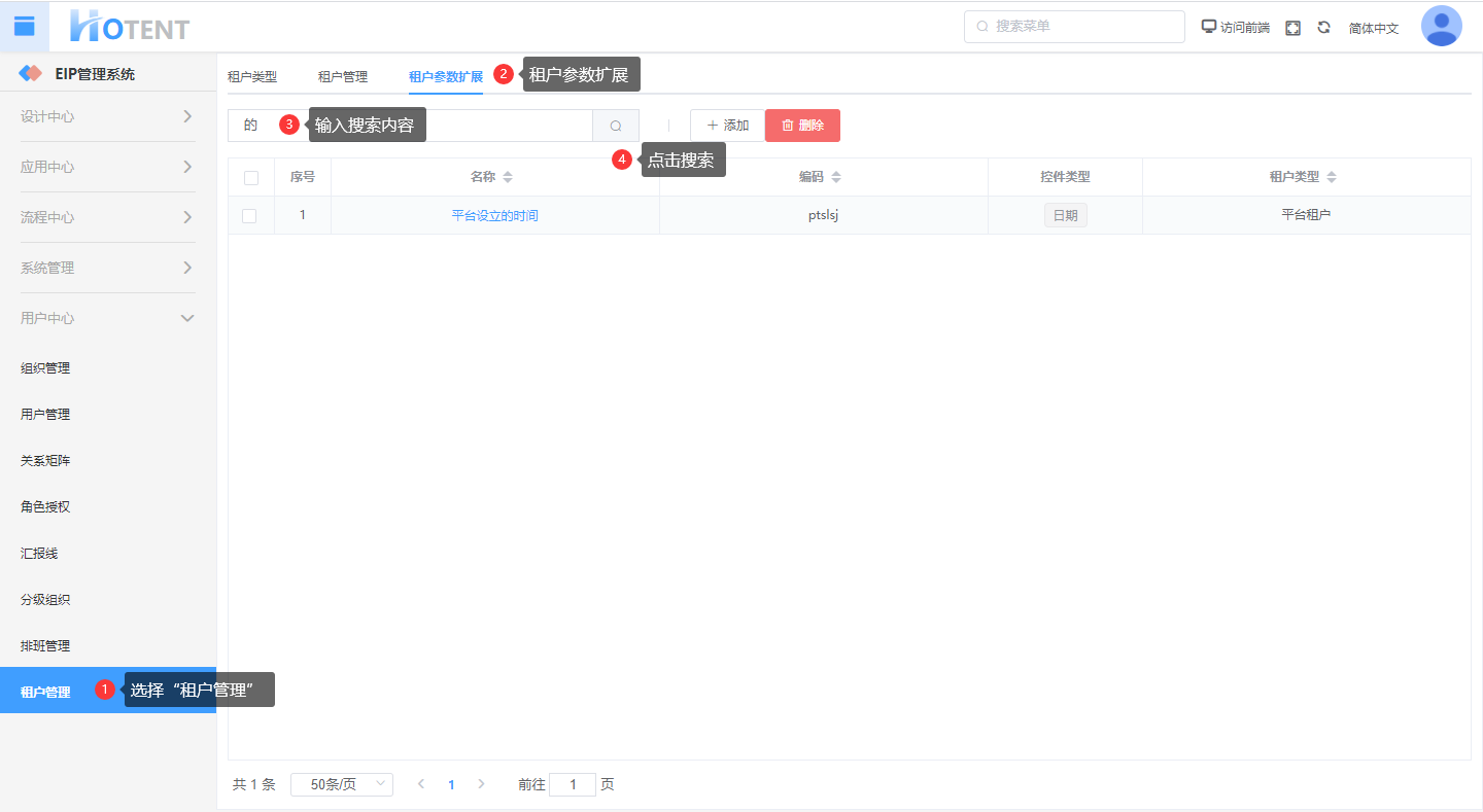 操作:【用户中心】→单击【租户管理】→『租户参数扩展』输入参数名称→点击搜索