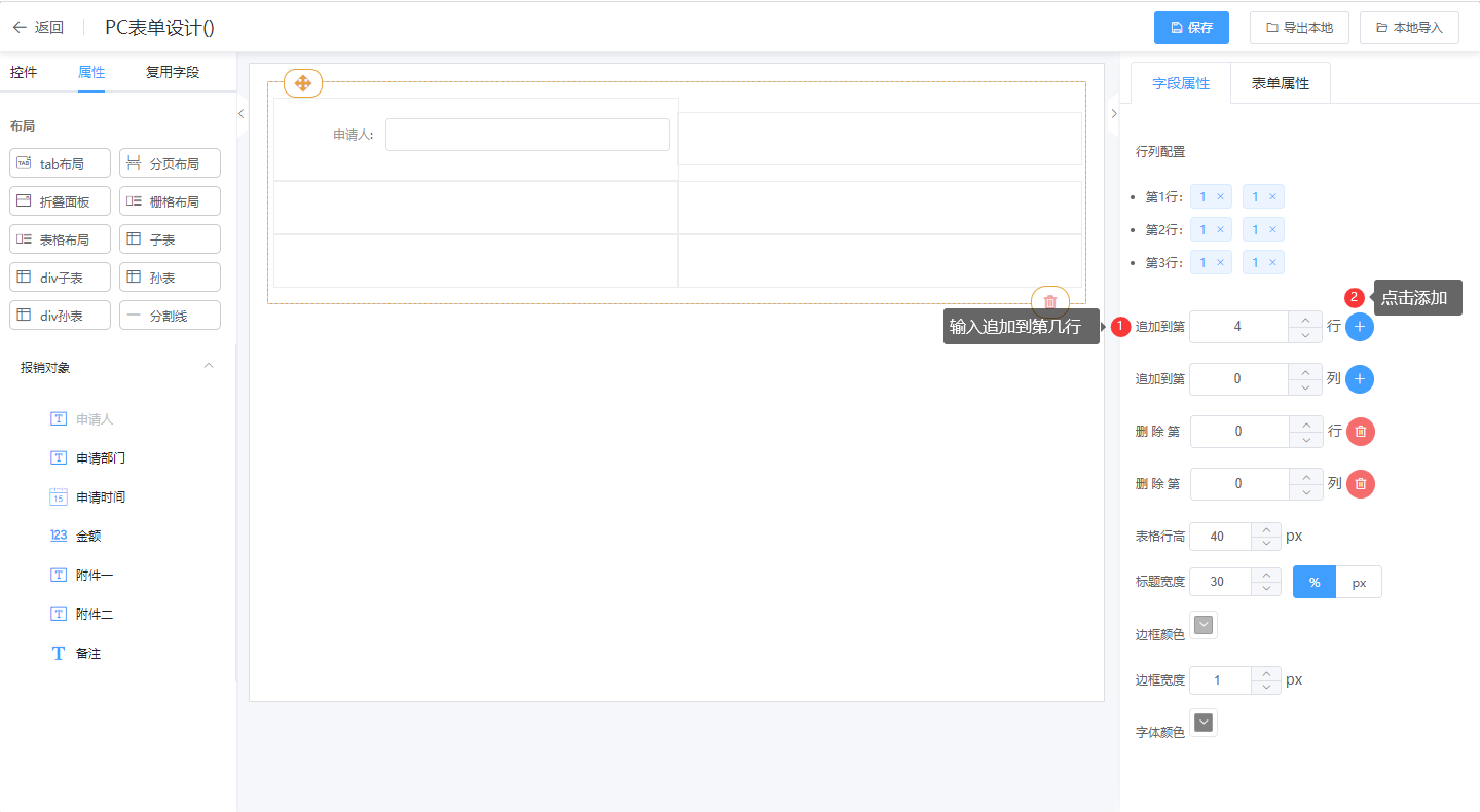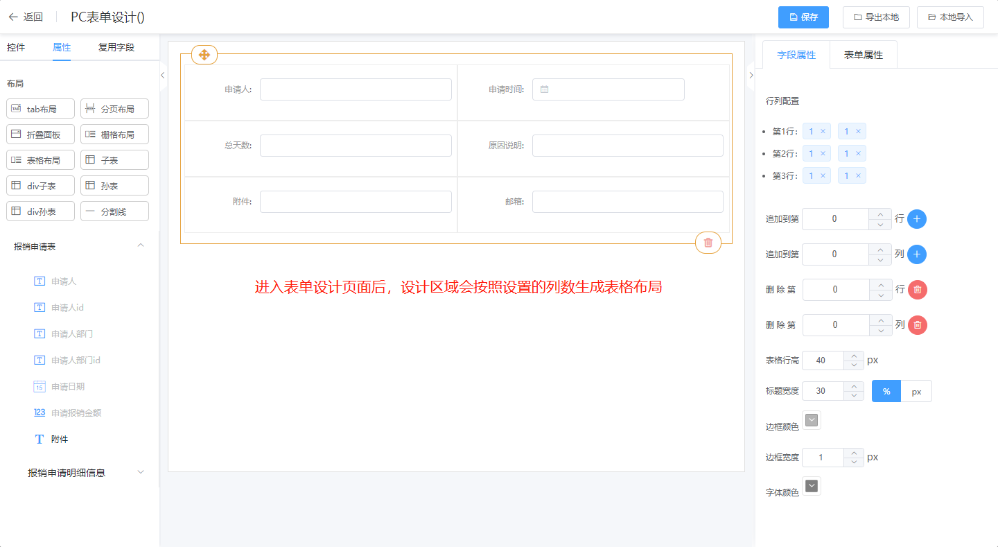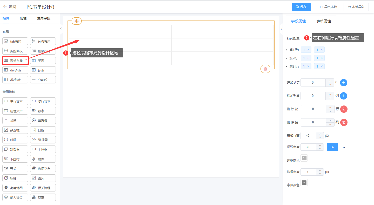 ② 在表单设计页面直接拖拉“表格布局”控件到设计其区域;