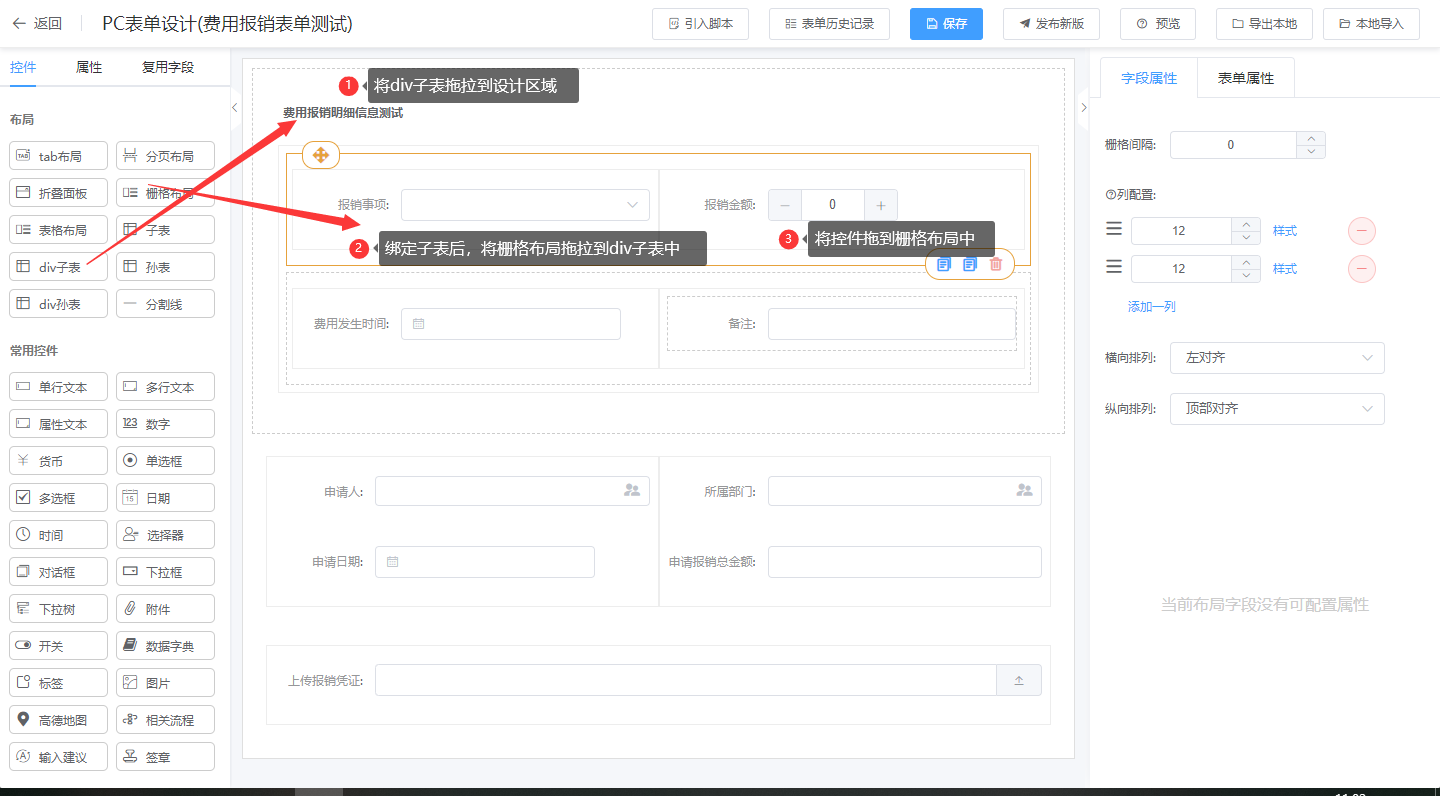 第二步:绑定子表后,拖拉栅格布局到div子表中;