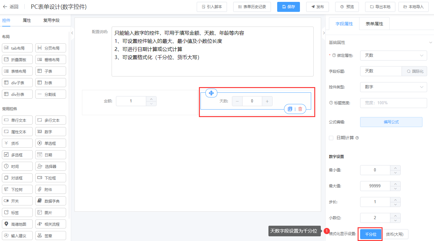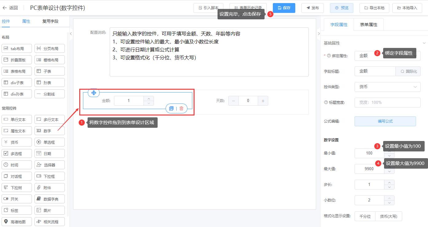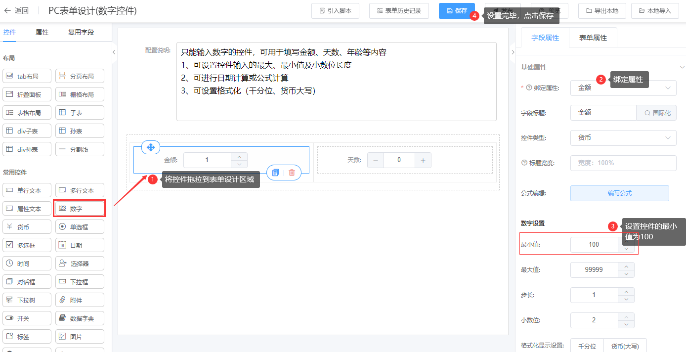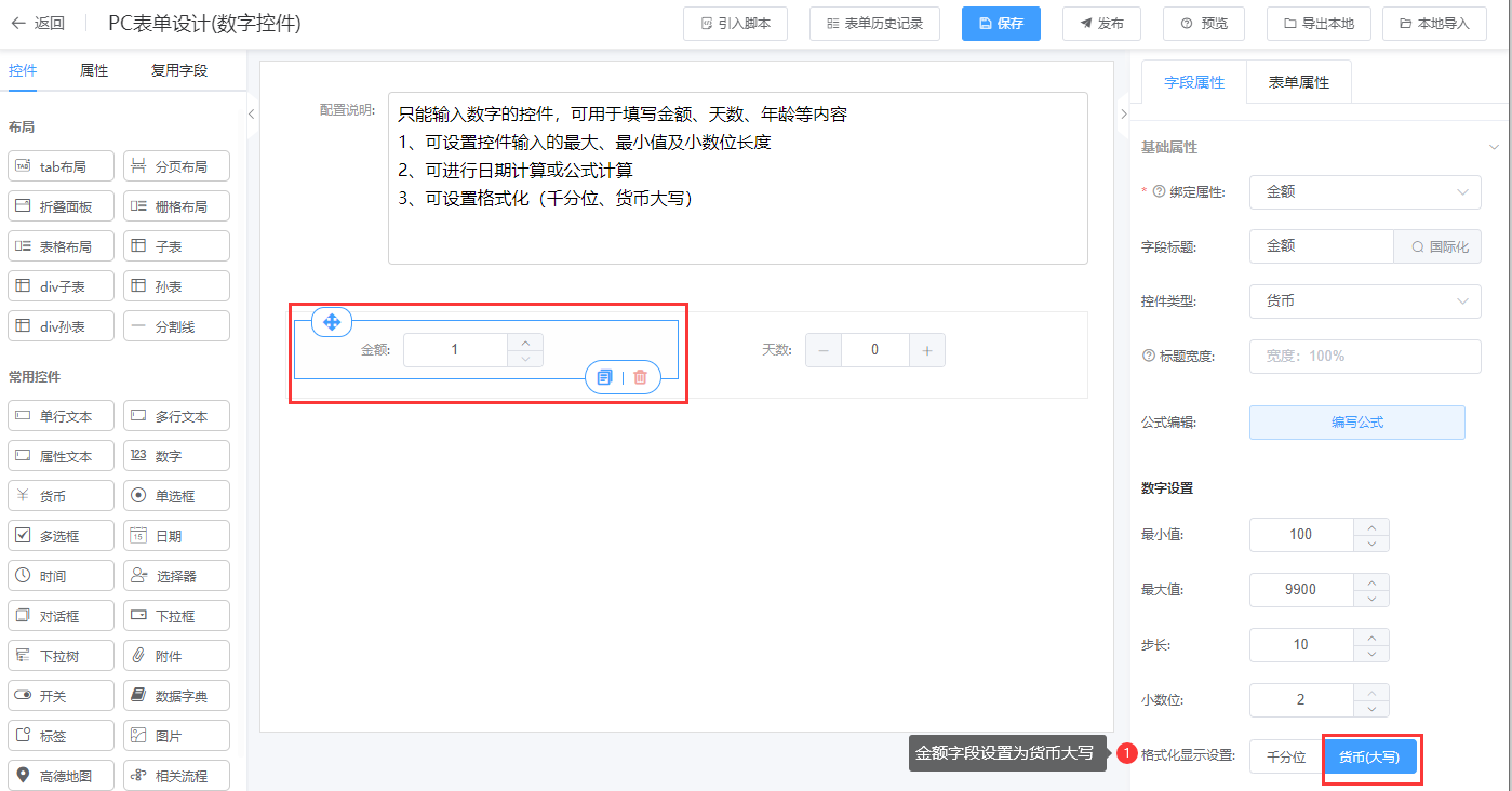第一步:进入表单设计器页面,将数字控件(货币控件)拖拉到对应的栅格布局中;