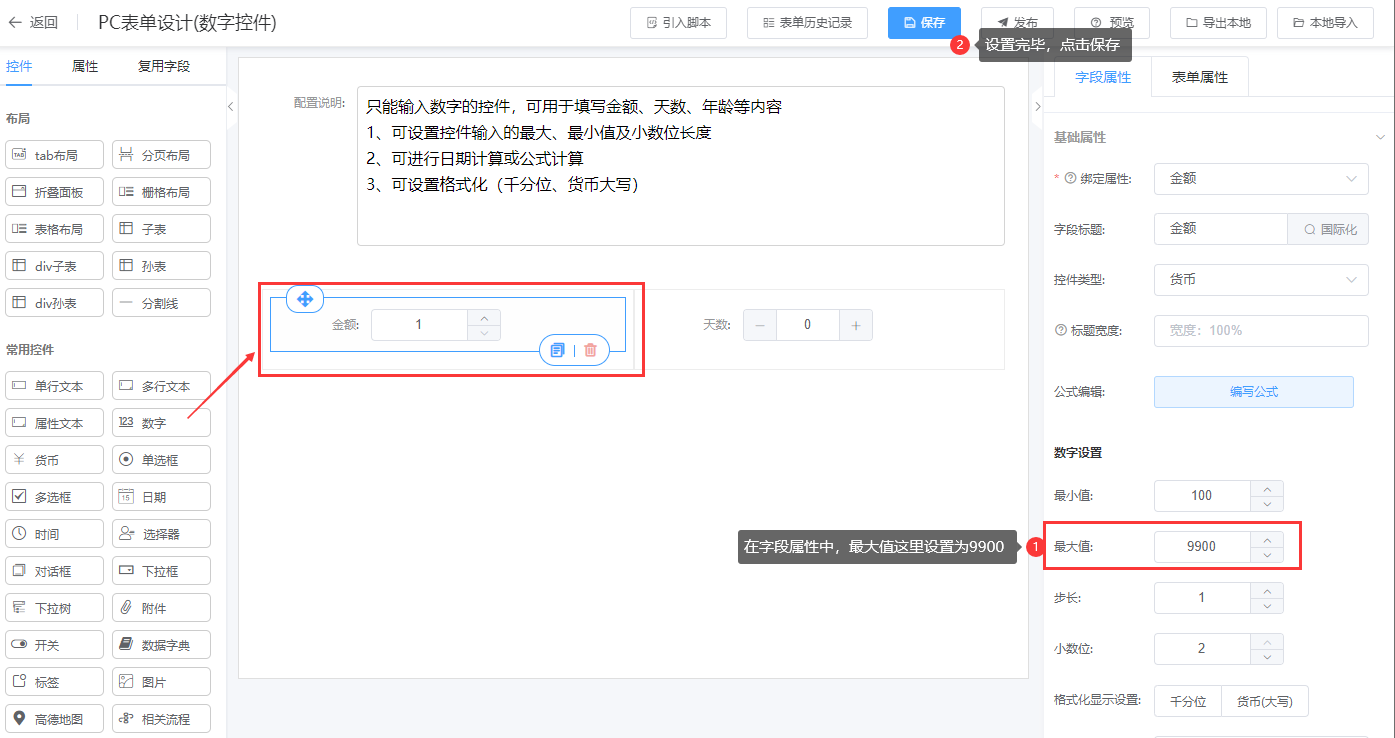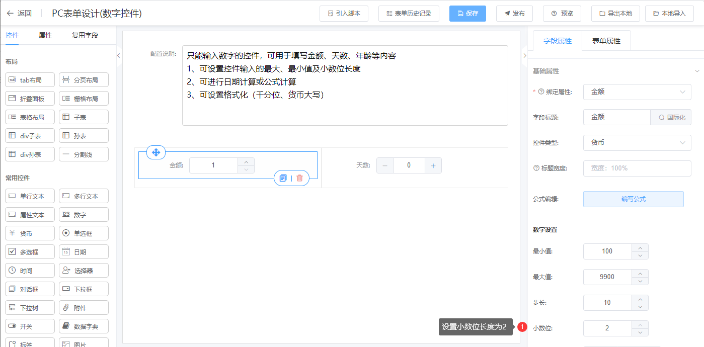 2、数字控件的小数位最大长度不能超过建模中设置的小数位长度
