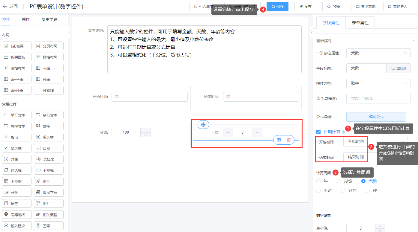 计算两个日期的差值,结果存储到数字控件中
