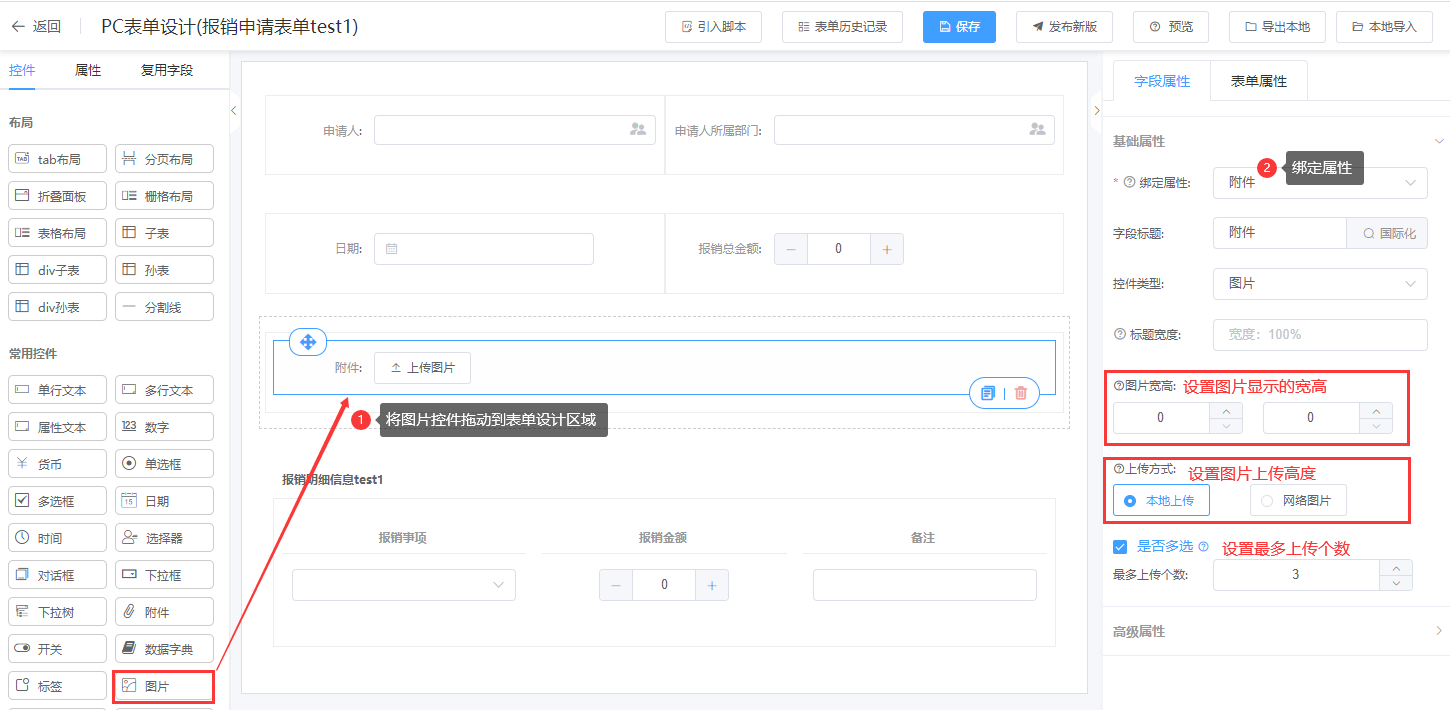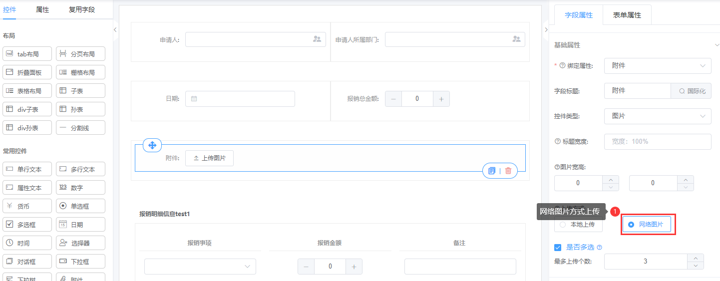 第一步:进入表单页面,将对应字段设置为图片控件,并设置对应的上传配置信息