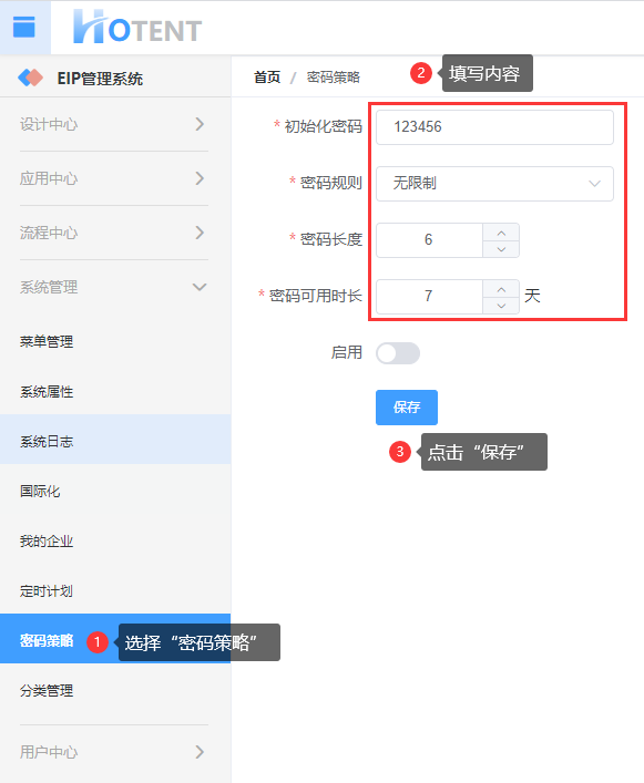操作:【用户中心】→【密码策略】→在『密码策略』中修改“初始化密码”、“密码规则”、“密码长度”、“密码可用时长”→单击“保存”