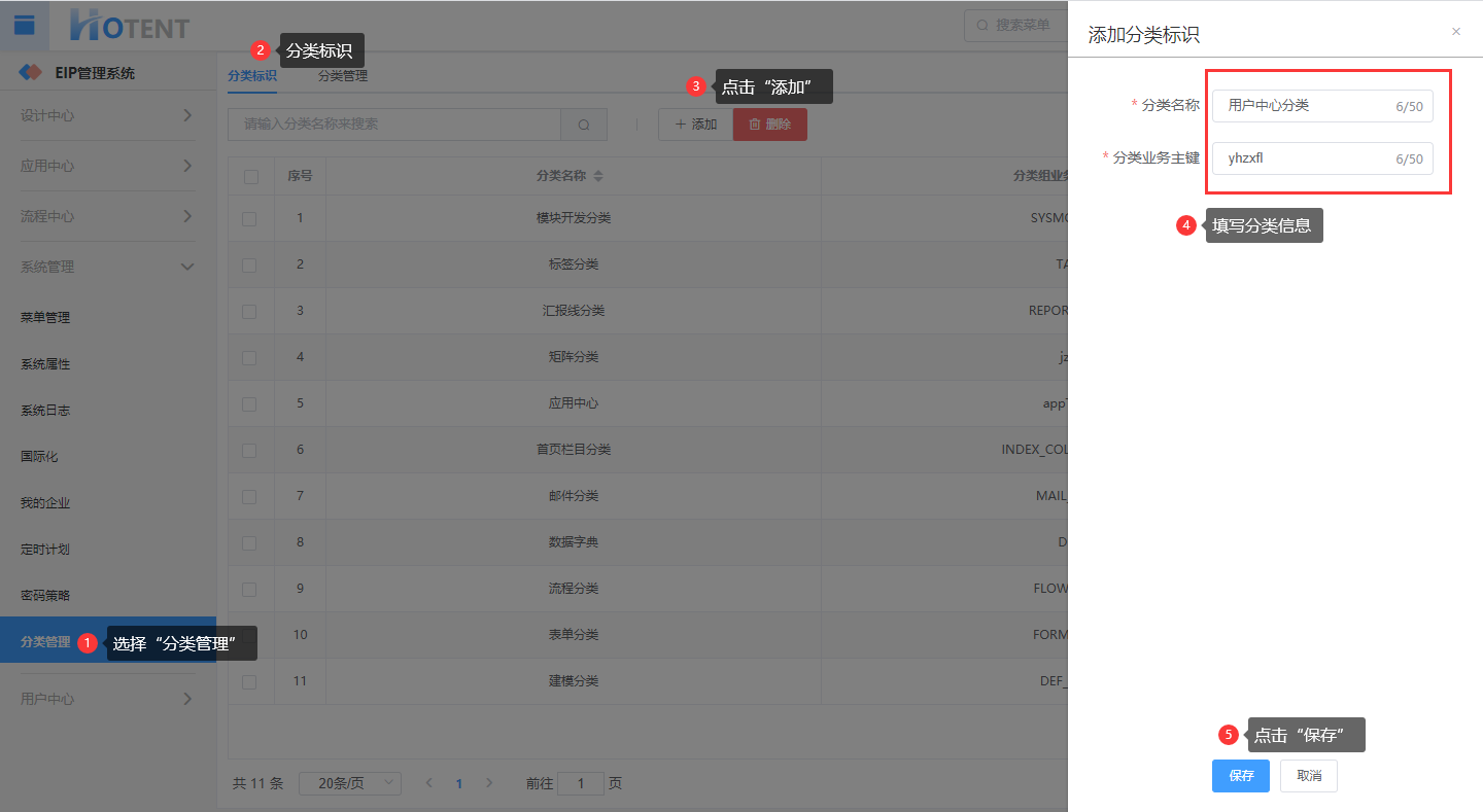 操作:【系统管理】→【分类管理】→【分类标识】→ 单击“添加” → 填写分类名称、分类业务主键 → 单击“保存”。
