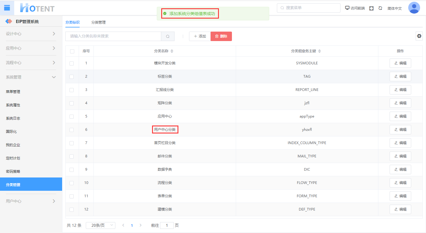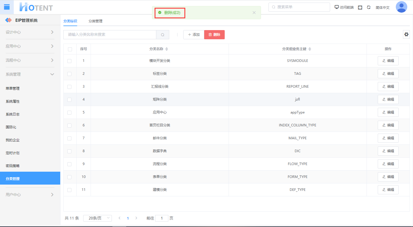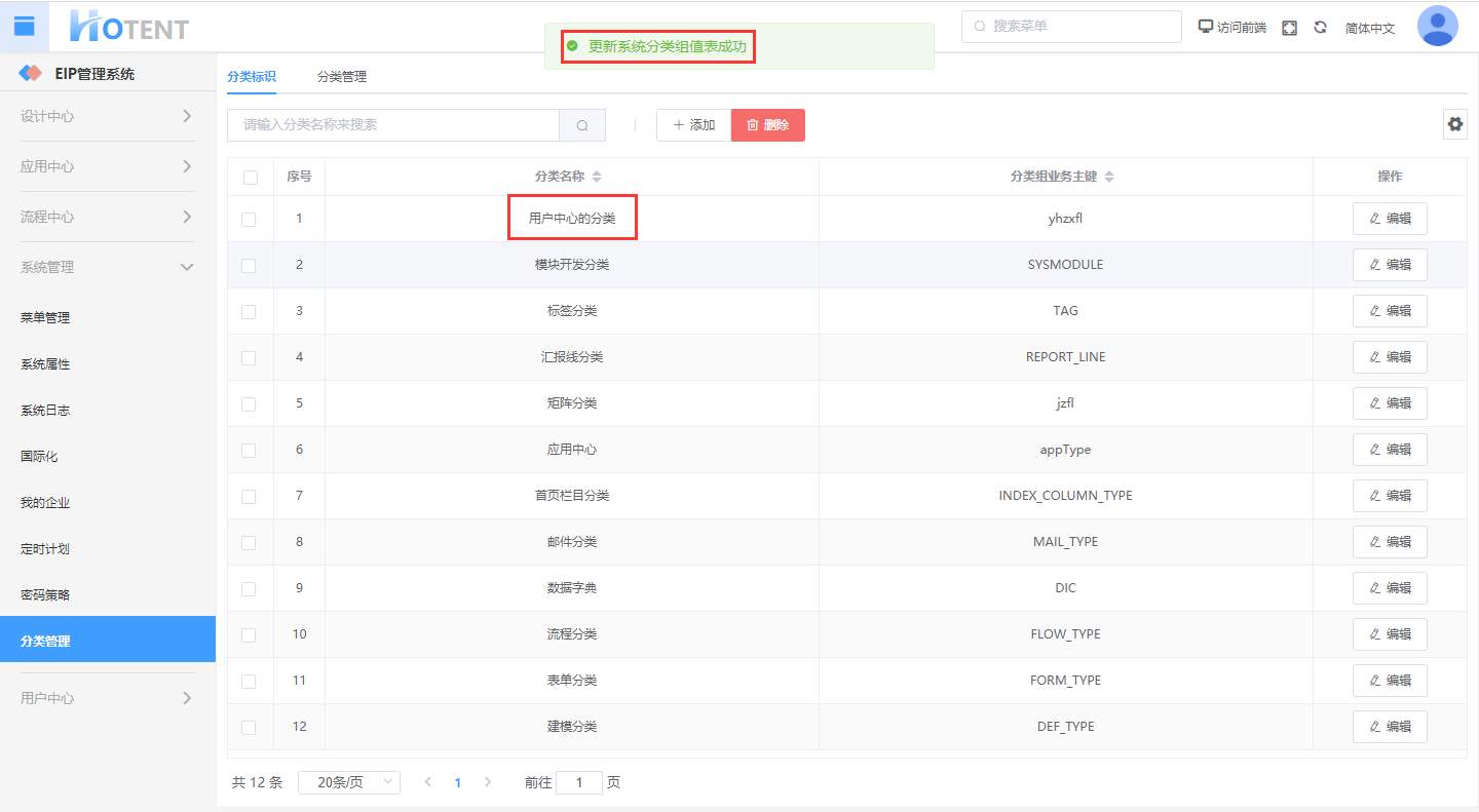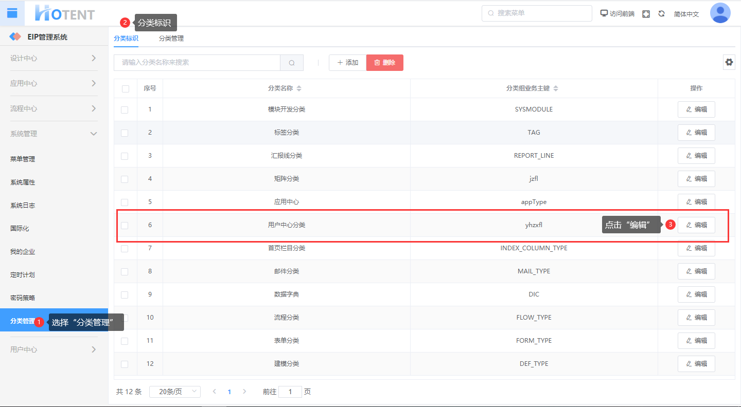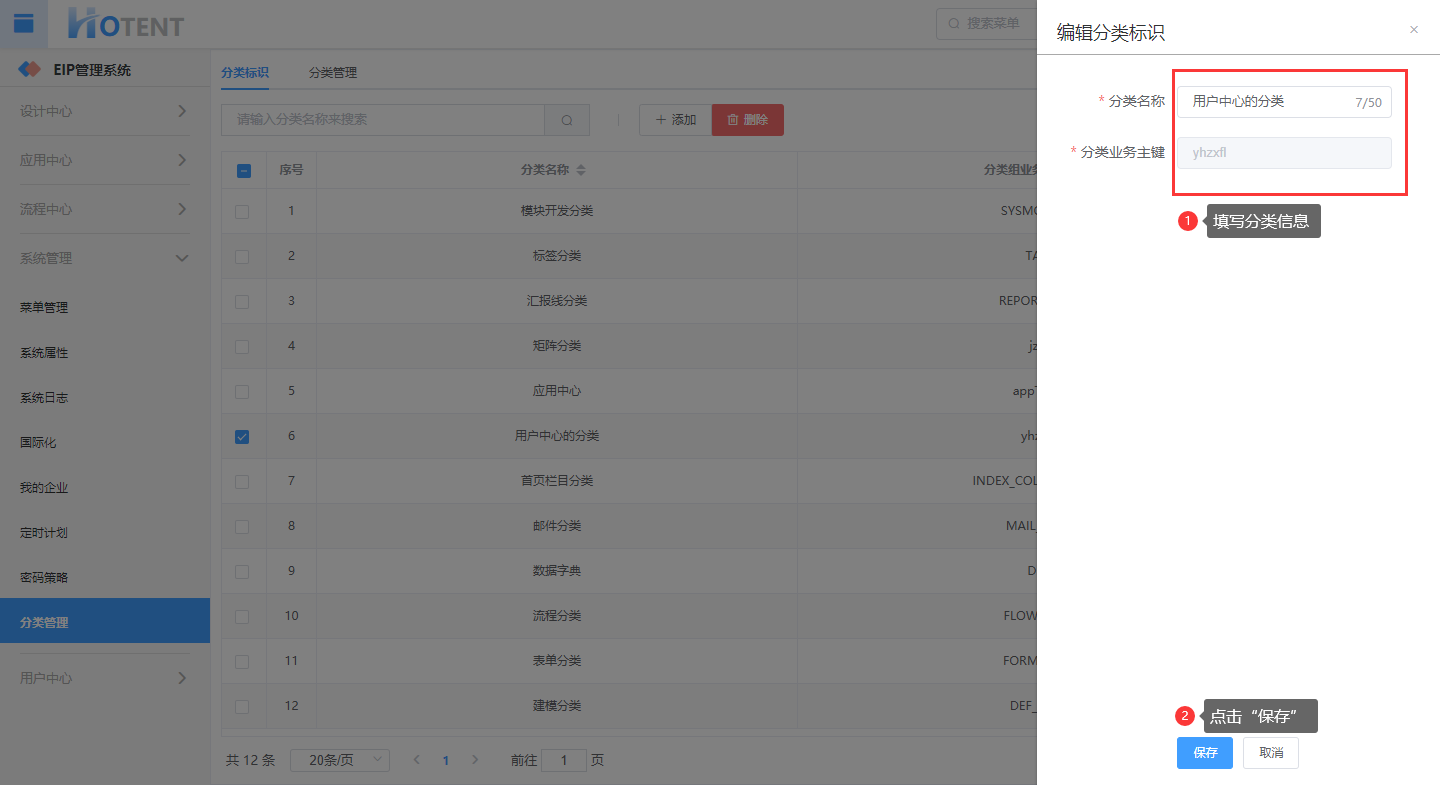 操作:【系统管理】→【分类管理】→【分类标识】→ 单击【编辑】→ 可修改分类标识名称 → 单击“保存""。