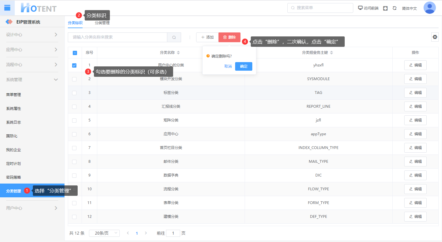 操作:【系统管理】→【分类管理】→【分类标识】→ 勾选需删除的分类标识→ 单击“删除” → 单击“确定”。