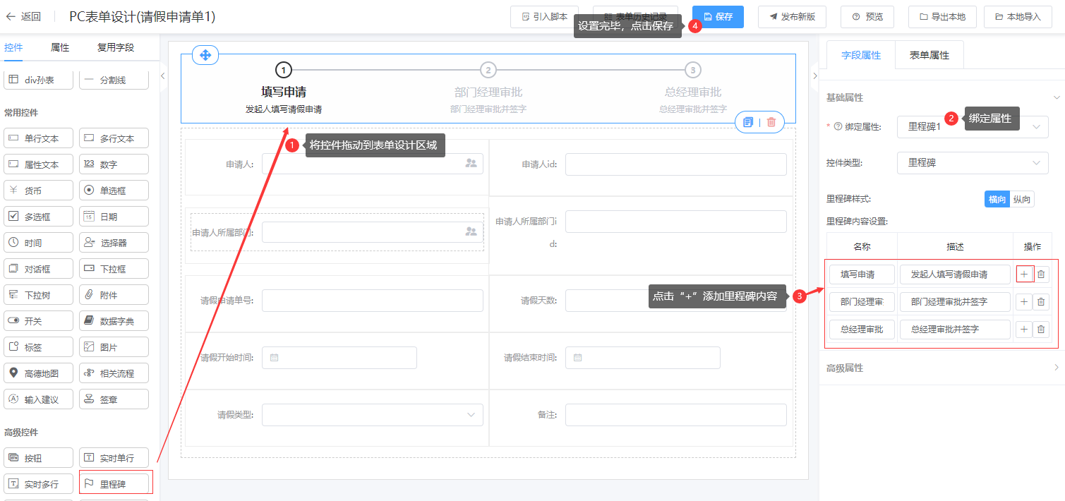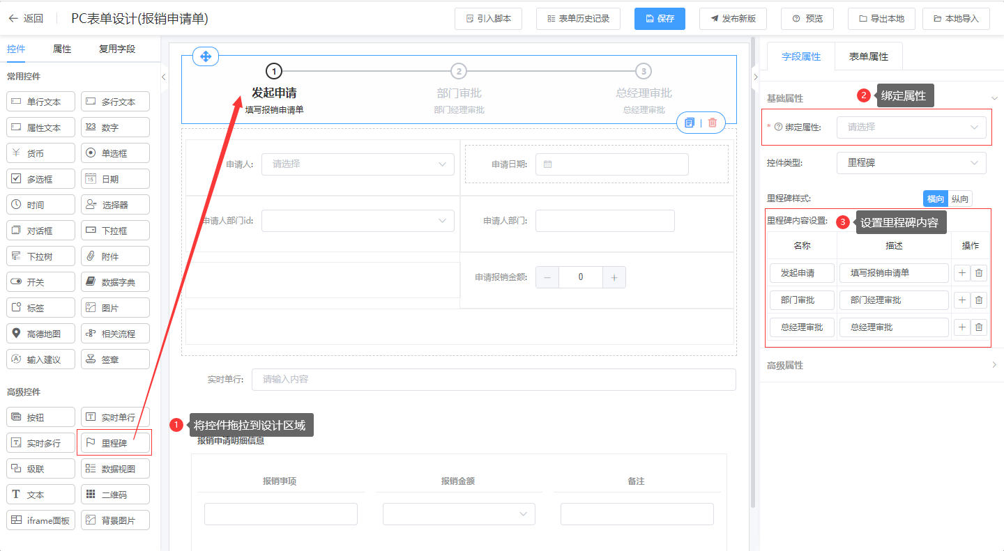 第一步:进入表单设计器页面,将里程碑拖拉到对应的布局中;