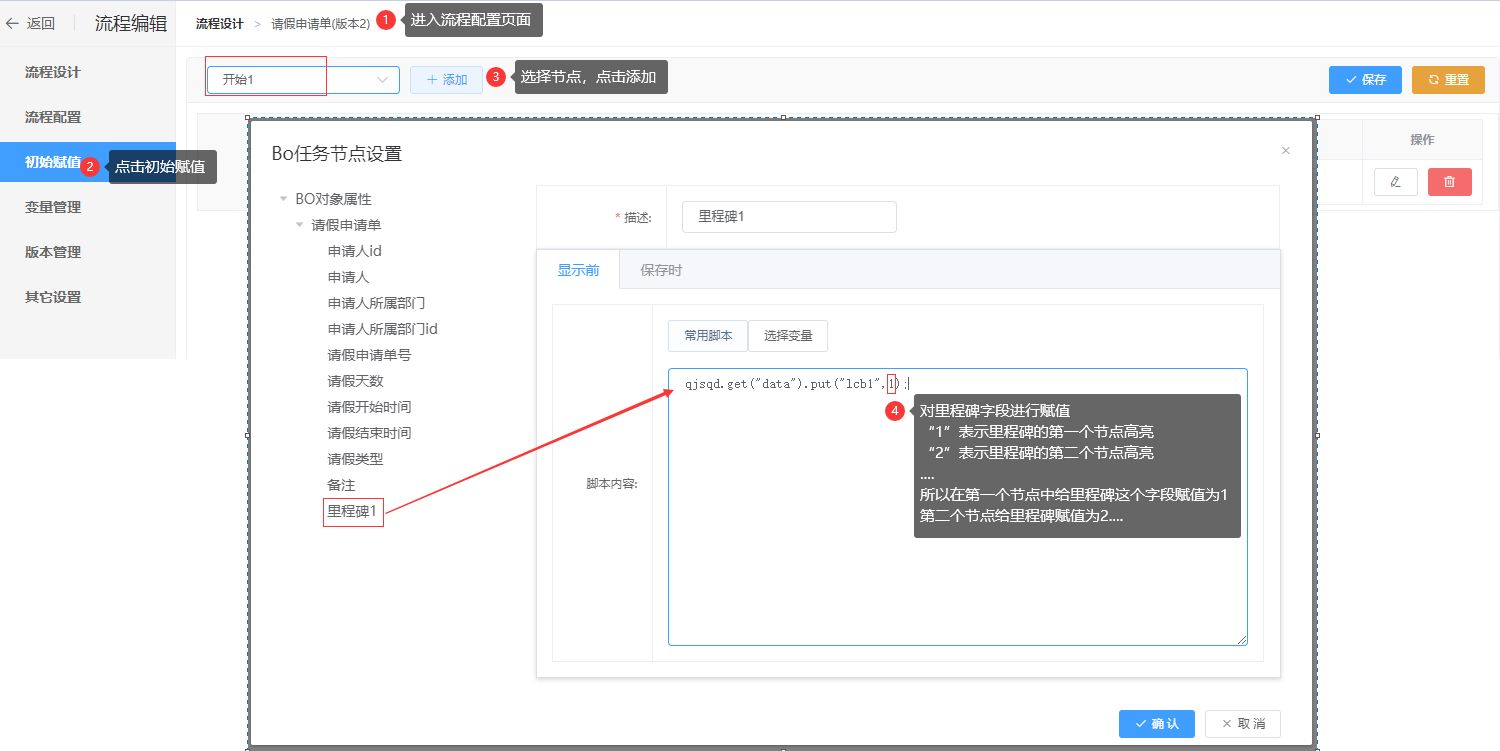 第二步:点击{初始赋值},按节点添加赋值设置,如下图;