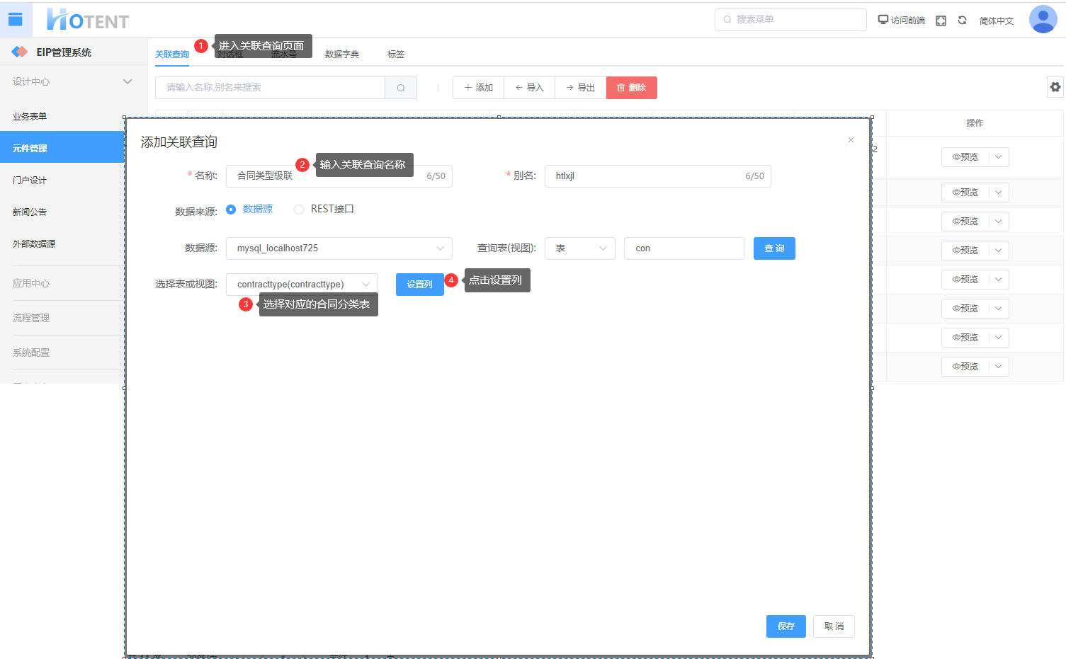 第一步:进入【元件管理】->【关联查询】中,配置级联的关联查询