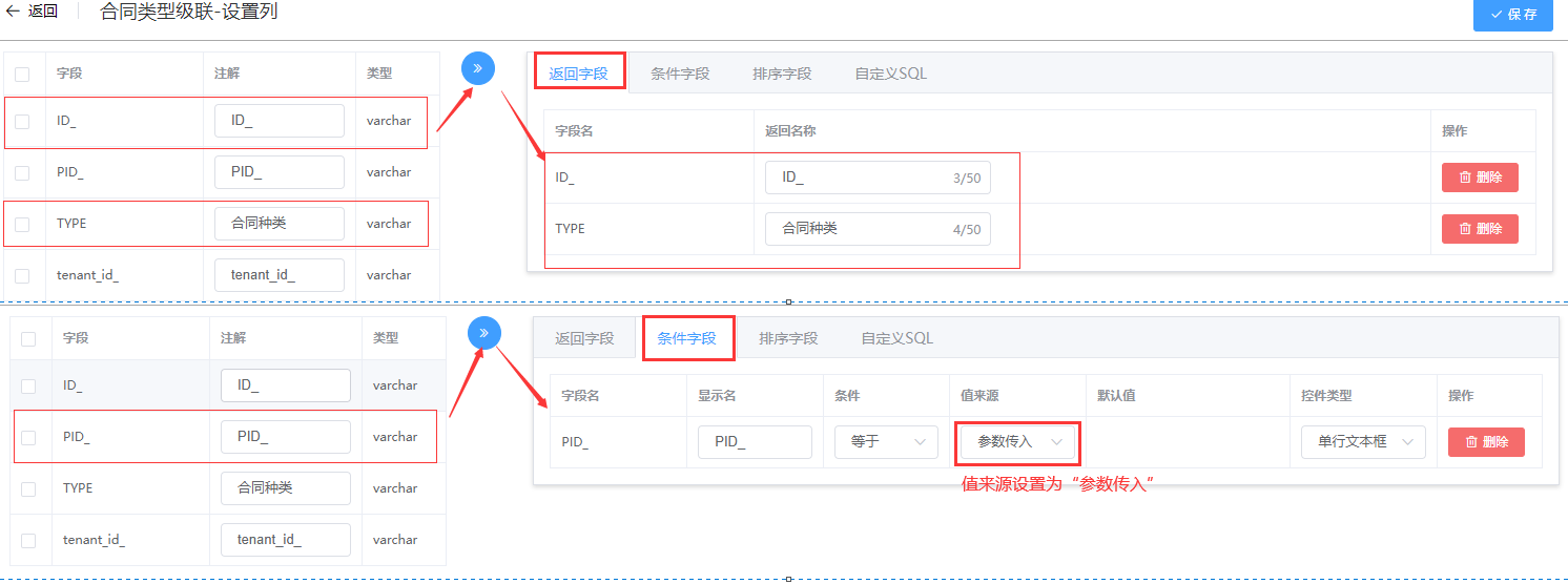 设置返回字段、条件字段