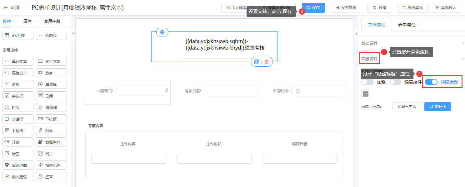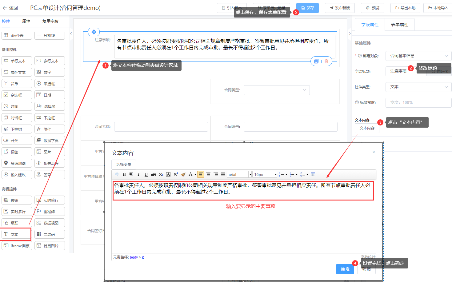 显示固定的文本内容(文本内容中可设置带有表单变量);
