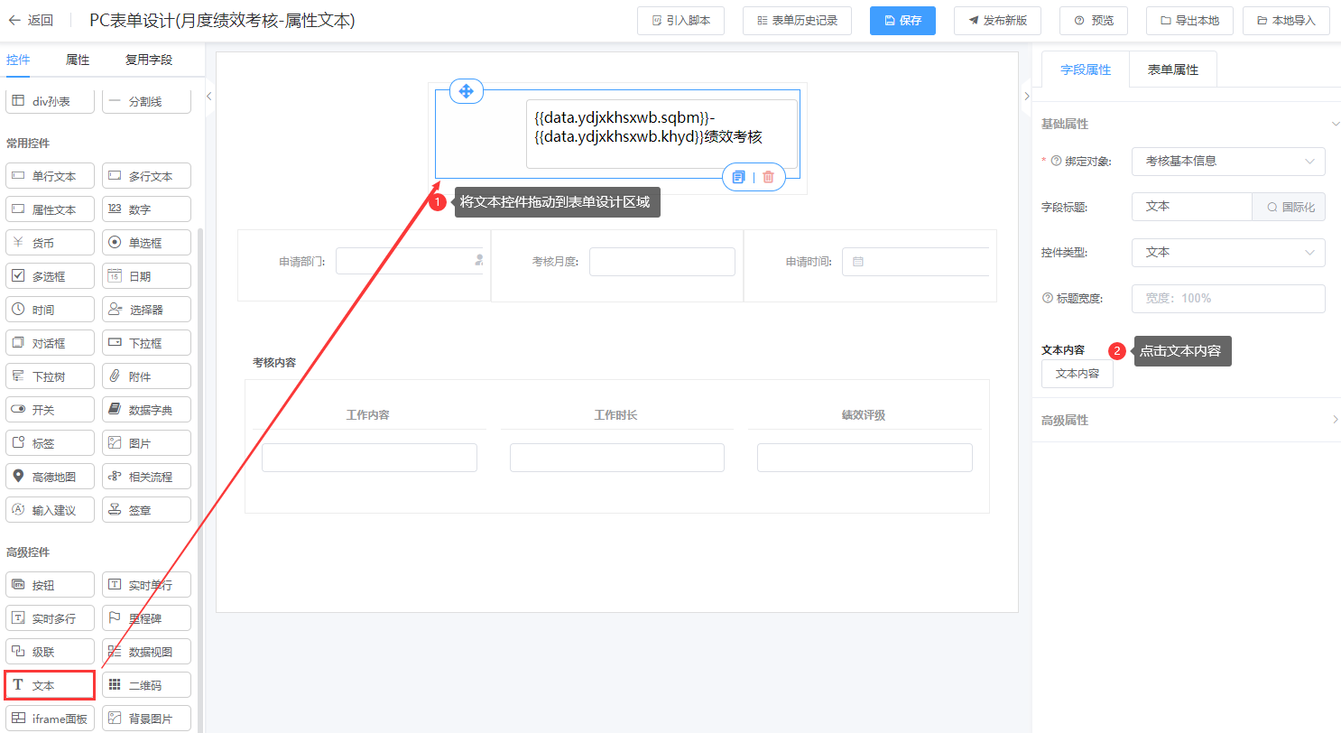 第一步:进入表单设计器页面,将文本拖拉到对应的栅格布局中;