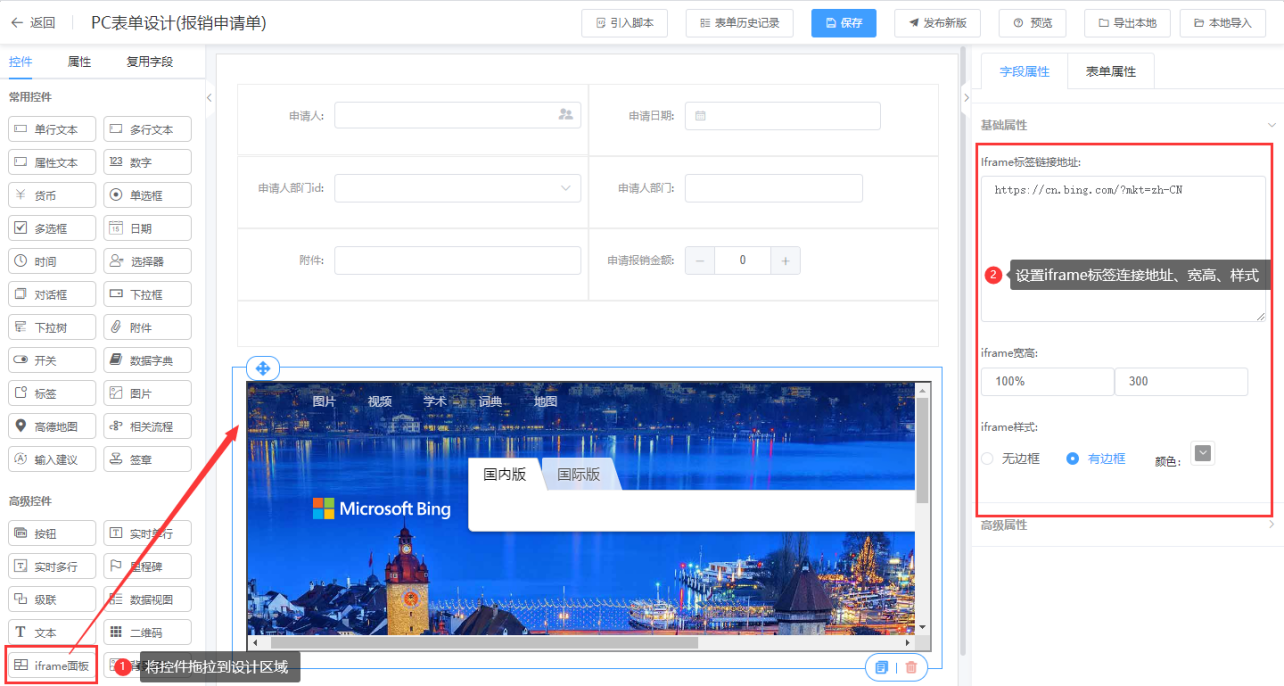第一步:进入表单设计器页面,将iframe面板控件拖拉到对应的栅格布局中; 第二步:设置iframe面板属性; 第三步:点击“保存”;