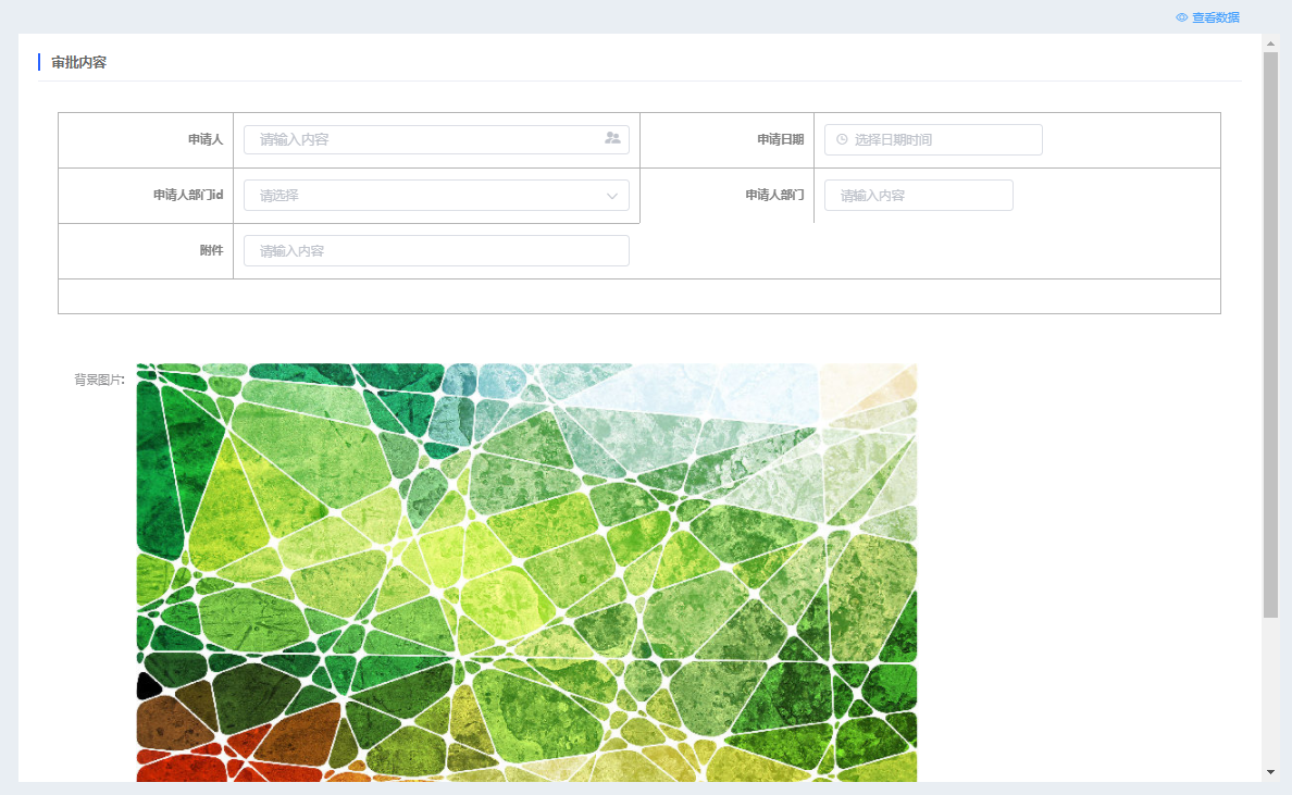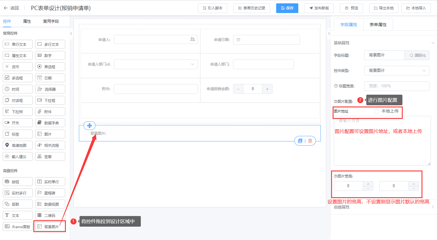 第一步:进入表单设计器页面,将背景图片控件拖拉到对应的栅格布局中; 第二步:进行图片配置; 第三步:点击“保存”或“发布新版本”即可保存/发布表单;