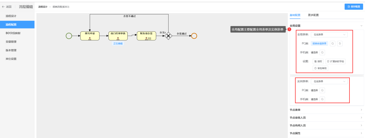 在基础配置模块中有四个配置项,分别是:全局设置、节点表单、节点人员、节点属性。下面分别进行介绍。流程只有绑定全局表单或者节点表单后才可以启动。