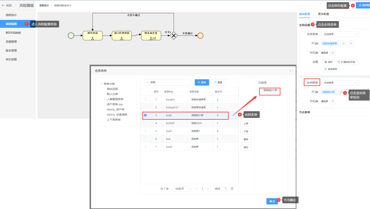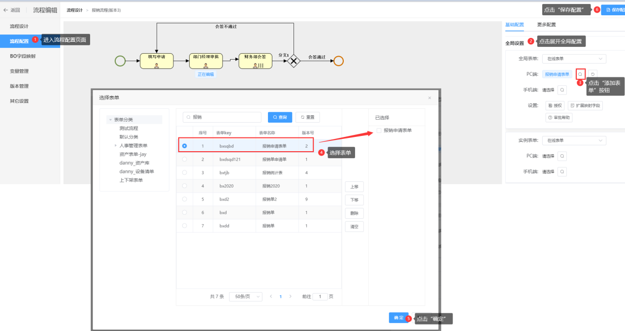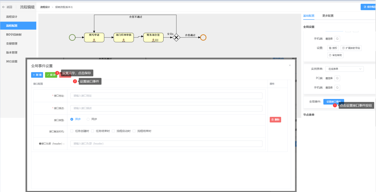 在全局设置中给流程配置全局表单、实例表单和全局事件。