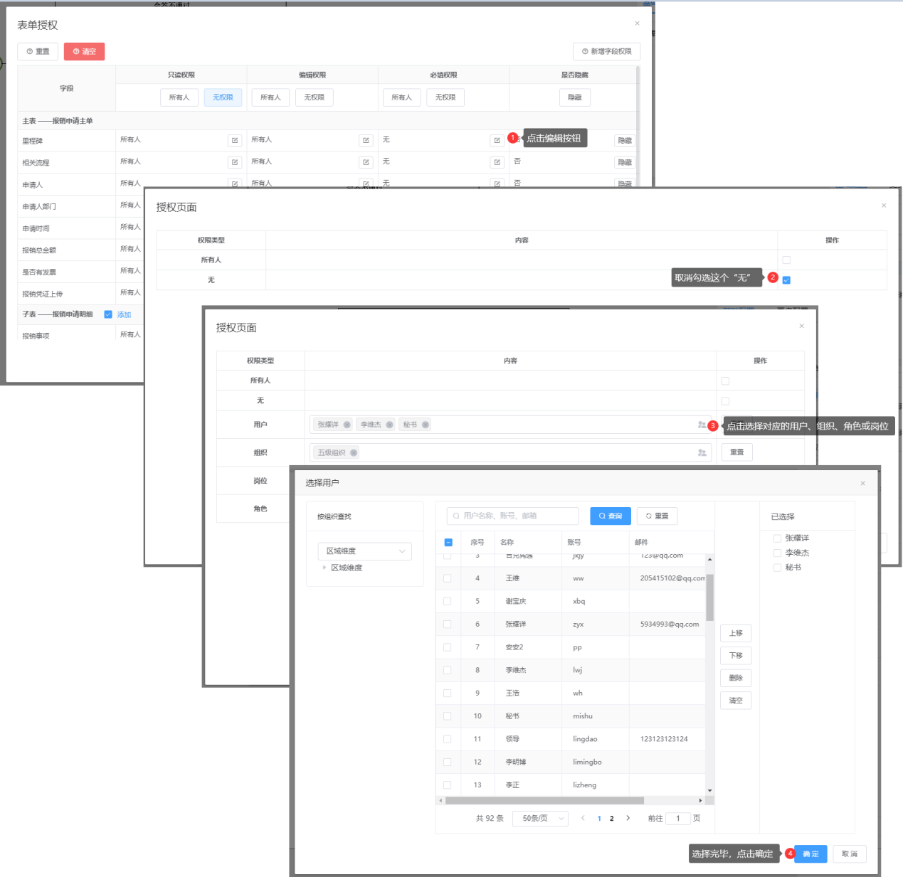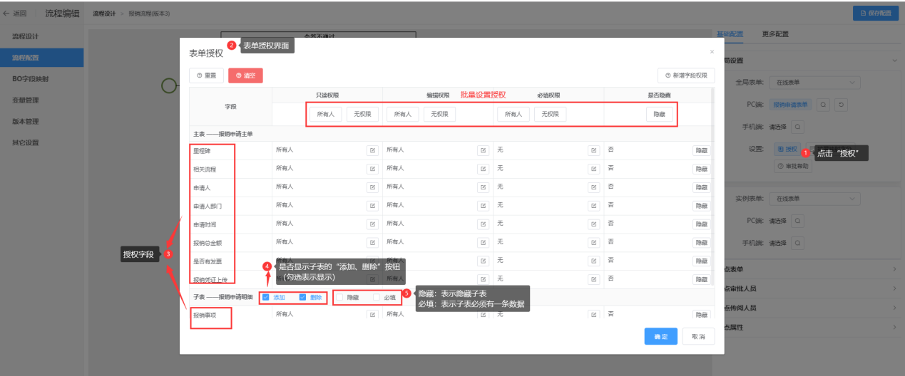 在流程审批页面中,表单中的字段对于不同的人有不同的权限,有的人是只读权限,有的人是编辑权限,有的人是必填权限,有的人没有该字段的查看权限,表单授权功能就是为了满足这样的需求。