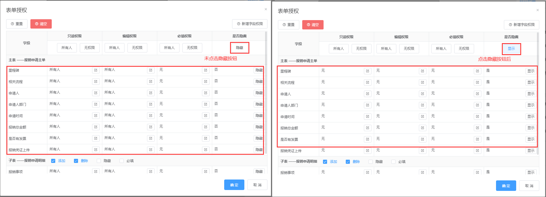在表单授权弹出框中点击“字段”列的“隐藏”按钮,主、子表所有字段的只读、编辑、必填都显示“无”,即主、子表所有字段的只读、编辑、必填权限不会授权给任何人,任何人启动、审批流程时,表单中的所有字段都隐藏,不显示。如下所示: