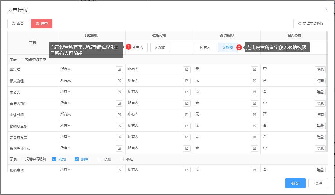 用户对子表的操作权限有四种“添加”,“删除”,“隐藏”,“必填”。子表的权限不能授权给具体的用户,在这里设置后,是所有人都有这样的权限。