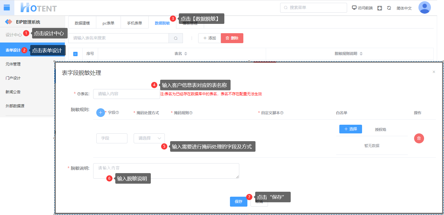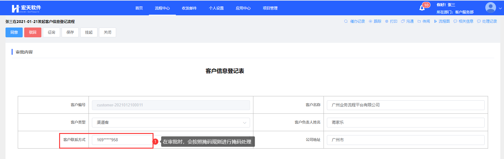 注:在流程中,不在数据脱敏中的白名单的用户,对“客户联系方式”这个字段进行修改是不生效的