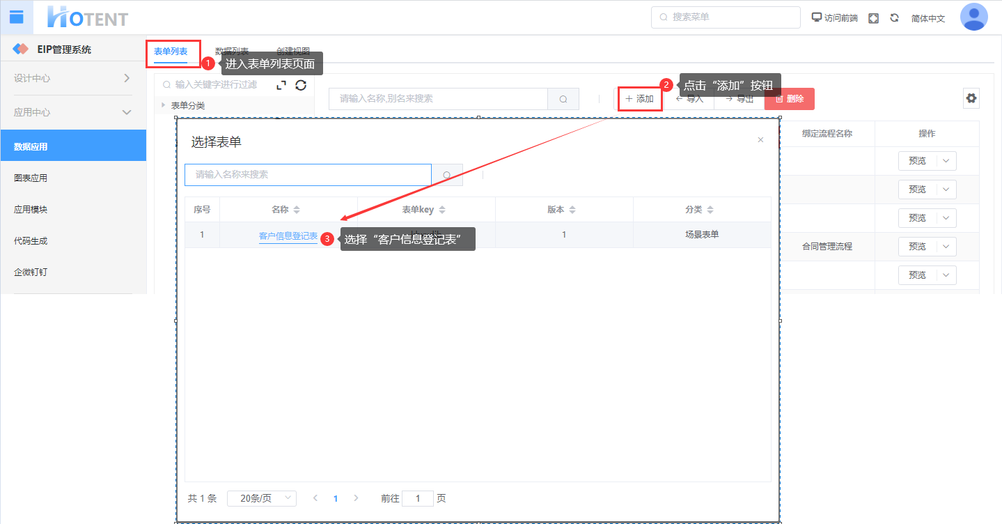 第一步:进入【表单列表】,将“客户信息登记表”添加为表单列表;