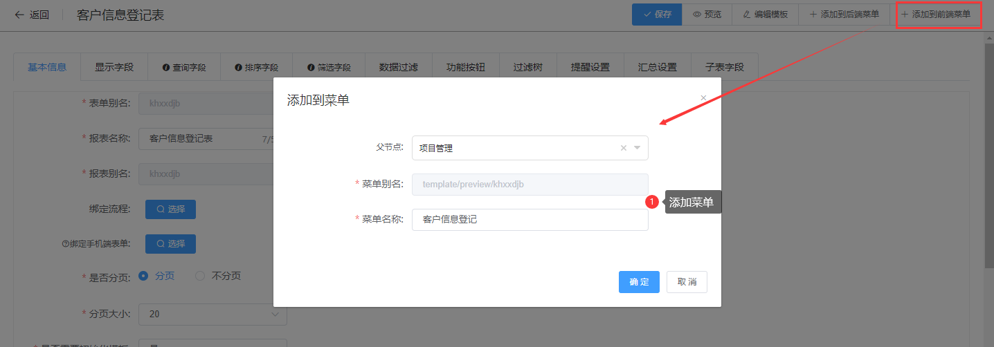 第二步:将“客户信息表”的表单页面,添加到前端菜单;