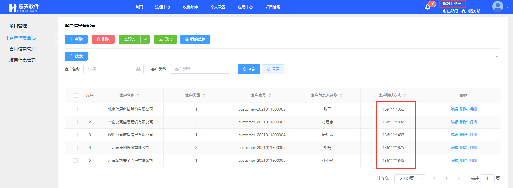 一般用户“张三”登录应用端,查看“客户信息登记”列表: