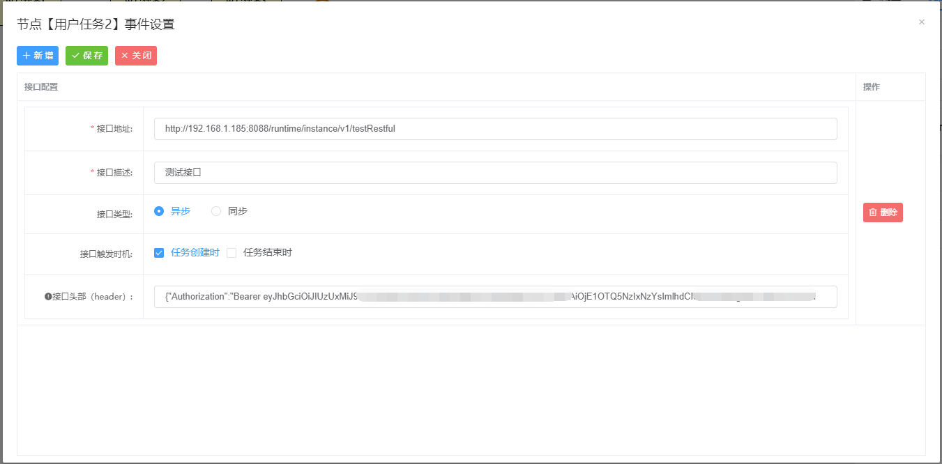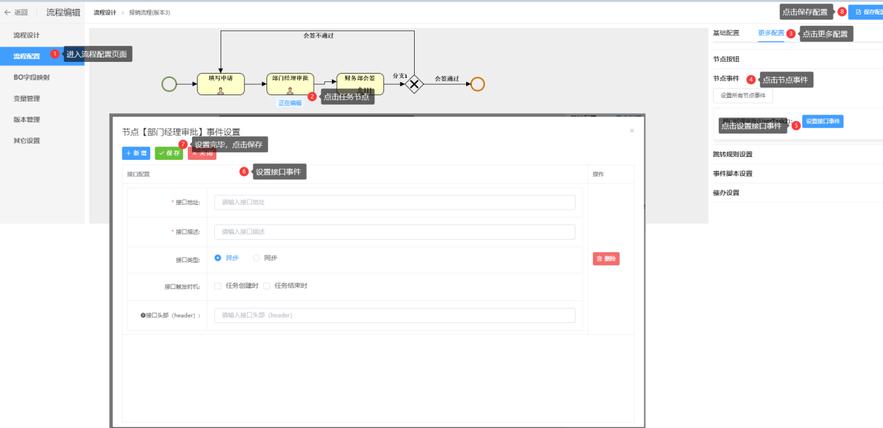 注:可点击新增添加多个接口事件,点击确定之后保存流程配置