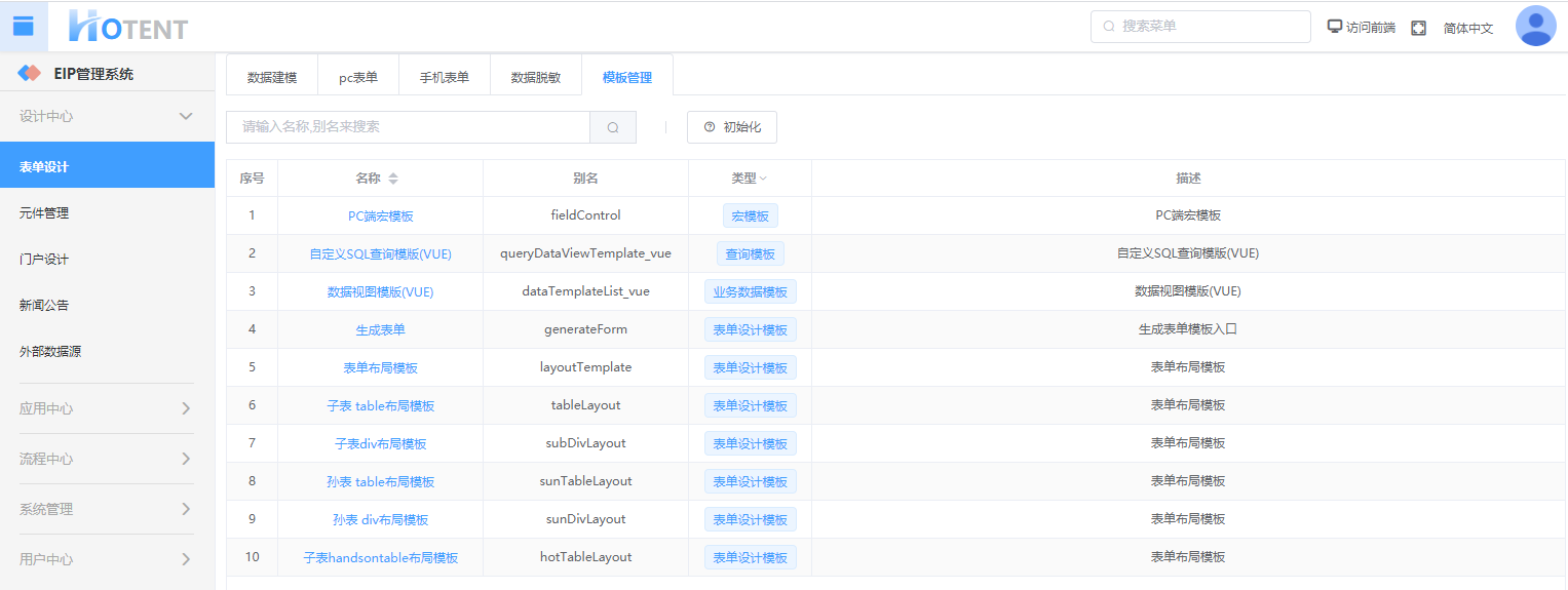 模板类型分为:宏模板、查询模板、业务数据模板、表单设计模板