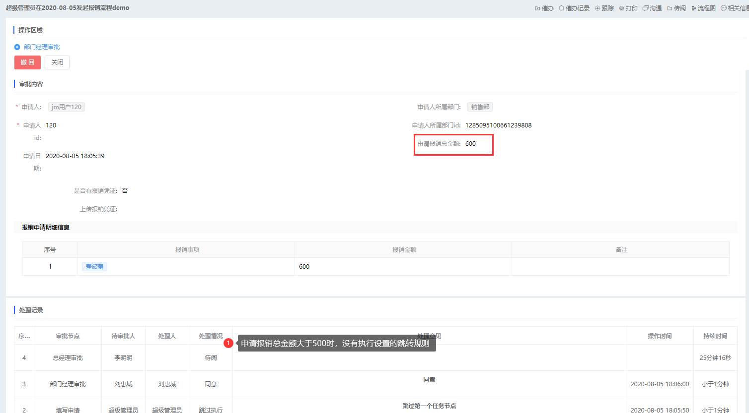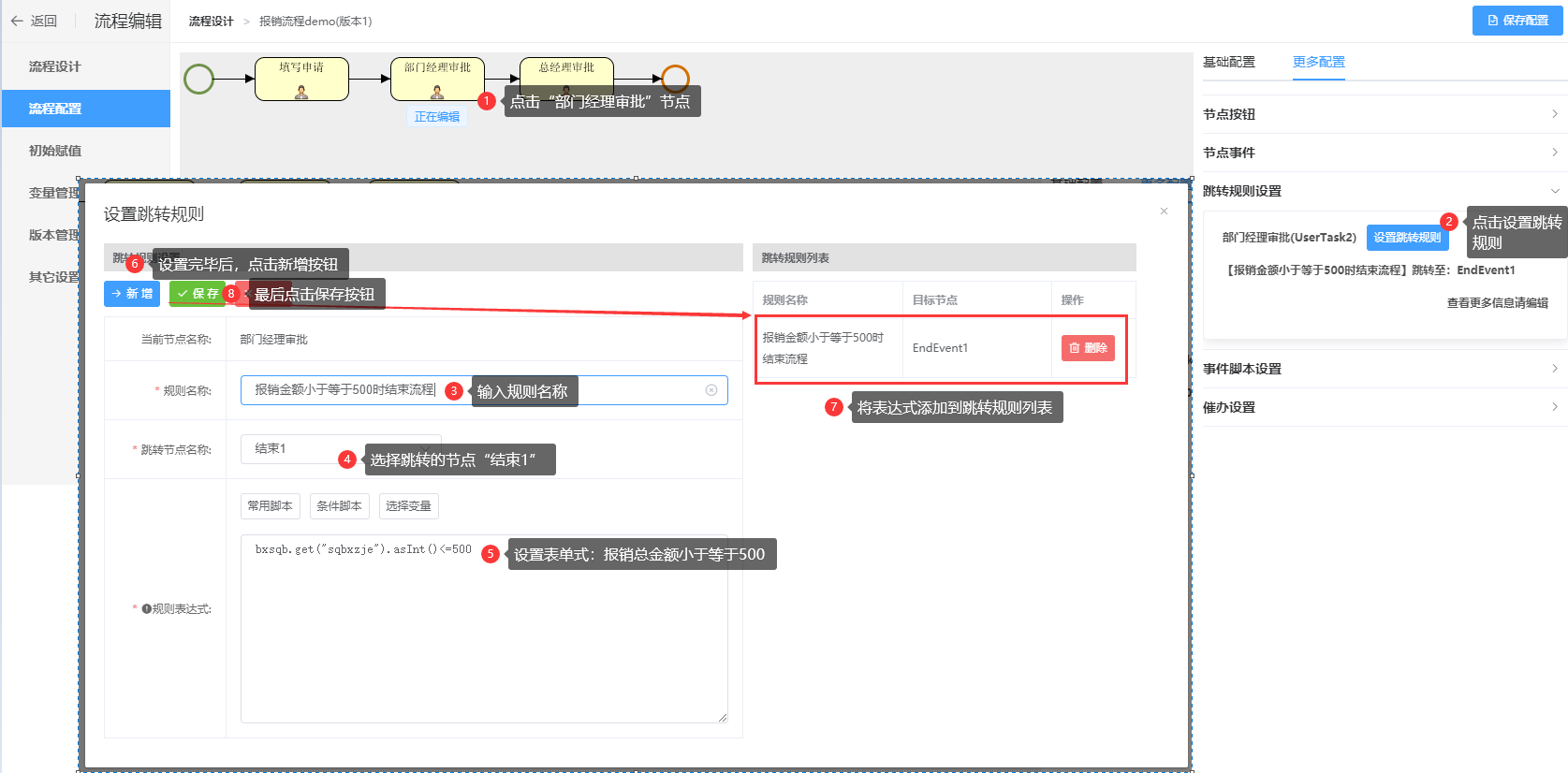 报销申请流程,表单内容“报销申请总金额”小于等于500时,跳过“总经理审批”环境,直接结束流程,流程图如下所示: