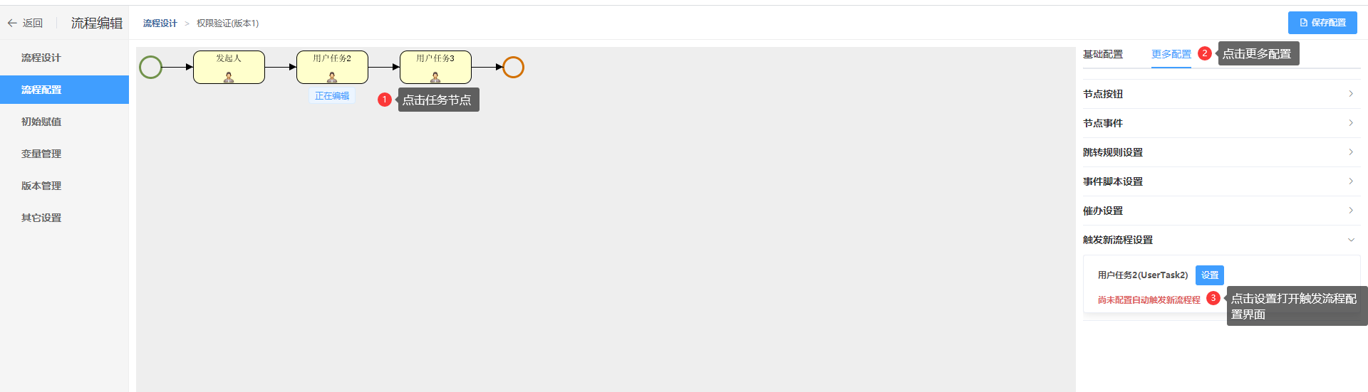 第二步:点击右侧页面更多配置,点击触发新流程设置;