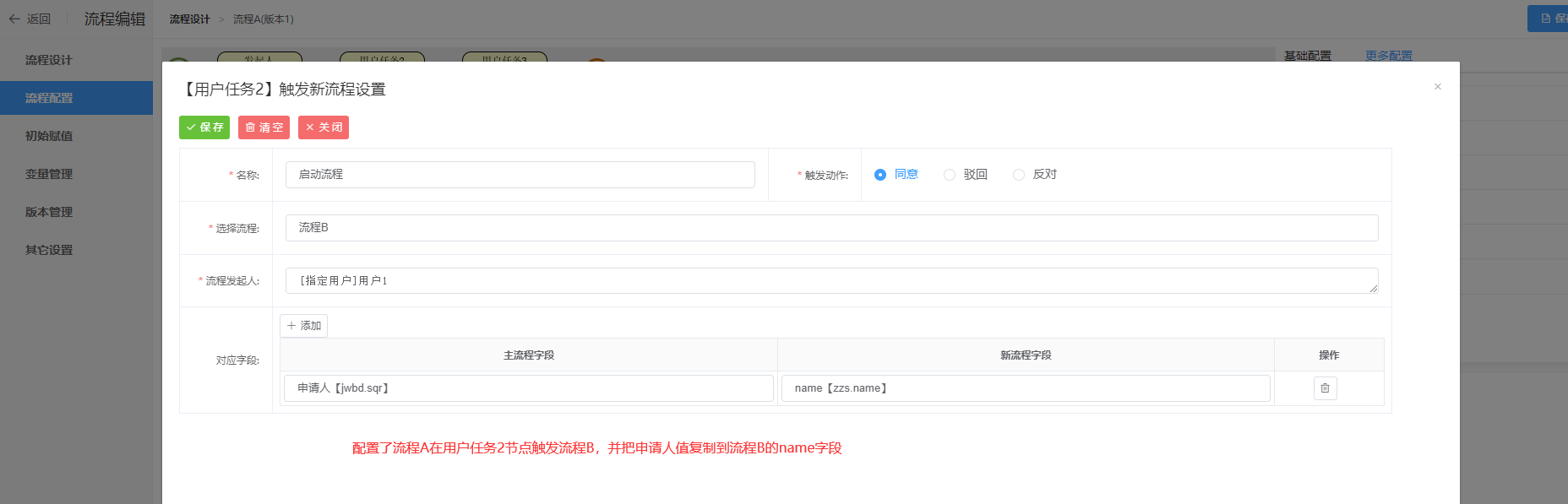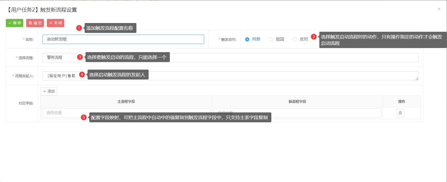 在流程审批过程中,可以通过配置触发新流程,在满足一定条件的情况下,启动新的流程,类型于外部子流程人,但又不相同,可以根据具体的场景选择不同的配置