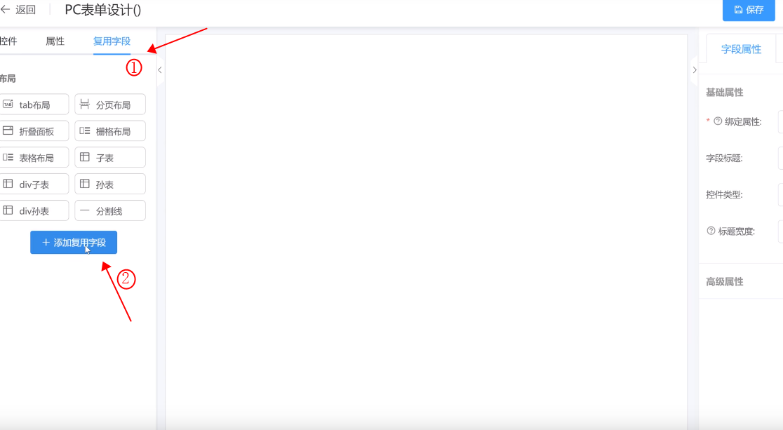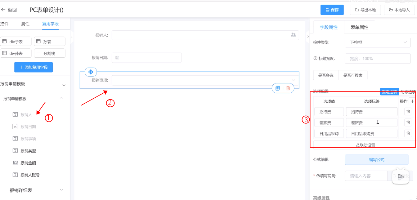 实例说明:例如需要创建两个报销申请单时,表单A是手动添加配置好所有控件的已存的表单,表单B只需要部分控件时可复用表单A已经配置好的控件;复杂的控件例如下拉框配置动态选项、设置关联查询,不想再配置一遍,则可以选择复用字段;