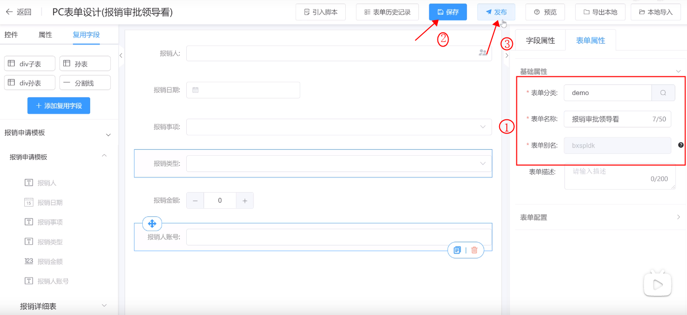 第三步,点开报销申请模板,拉取控件,右侧可以看到控件是已经配置好了;选好控件后,填写表单属性,可点保存,然后点发布,即可使用此表单;