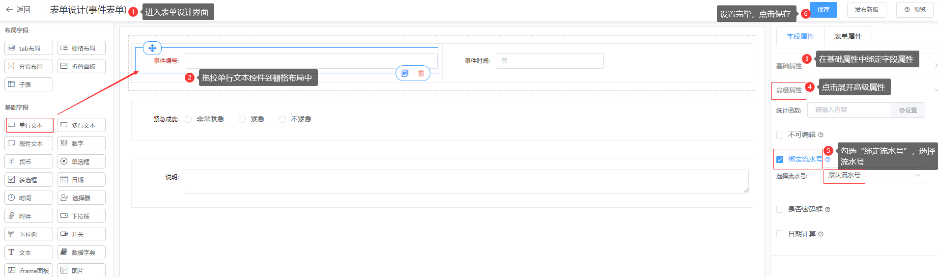 2. 流水号绑定表单的步骤在【业务表单】中的控件说明有详细介绍;
