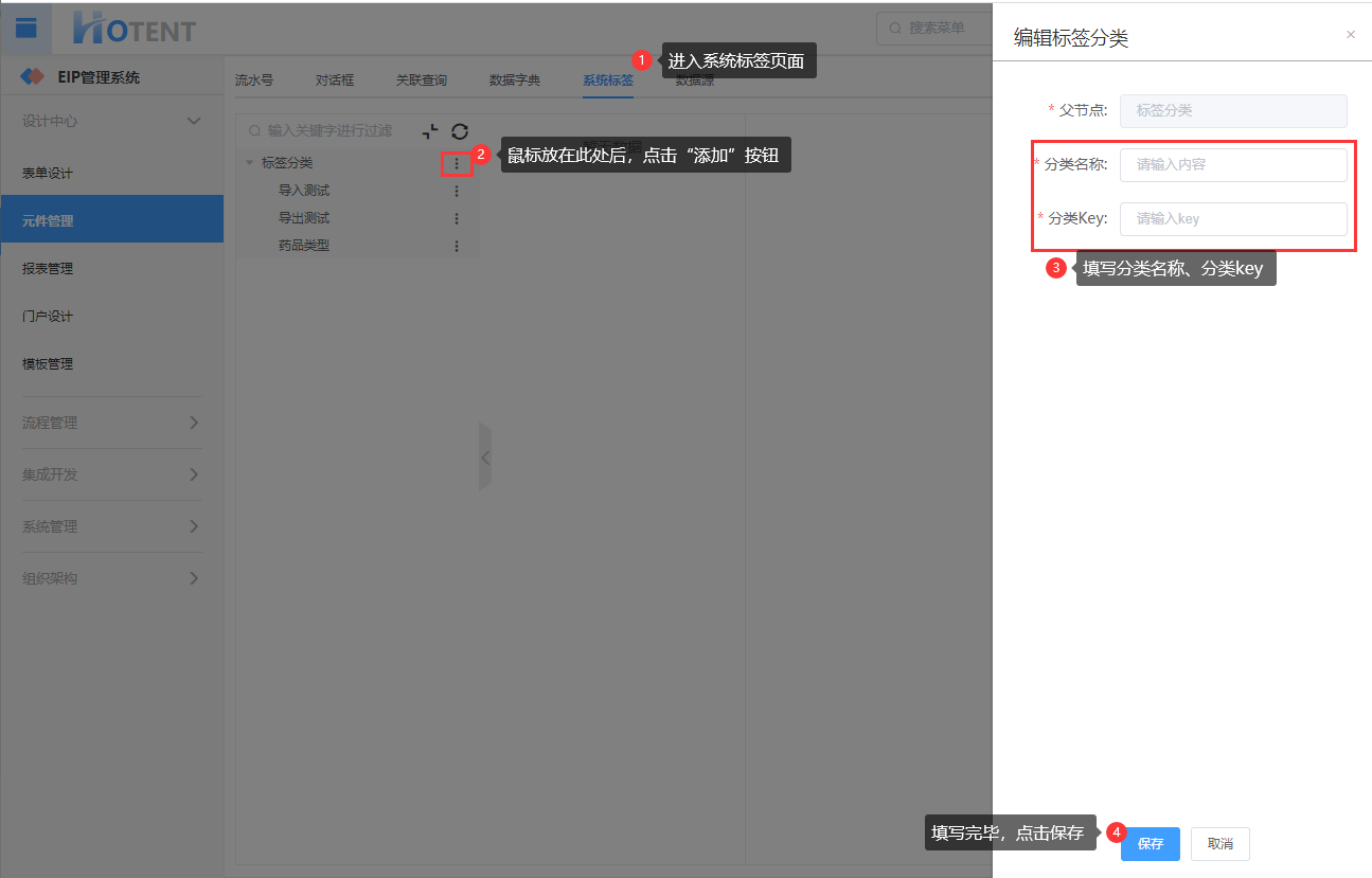 第一步:【设计中心】→【元件管理】→【系统标签】,单击“添加”;