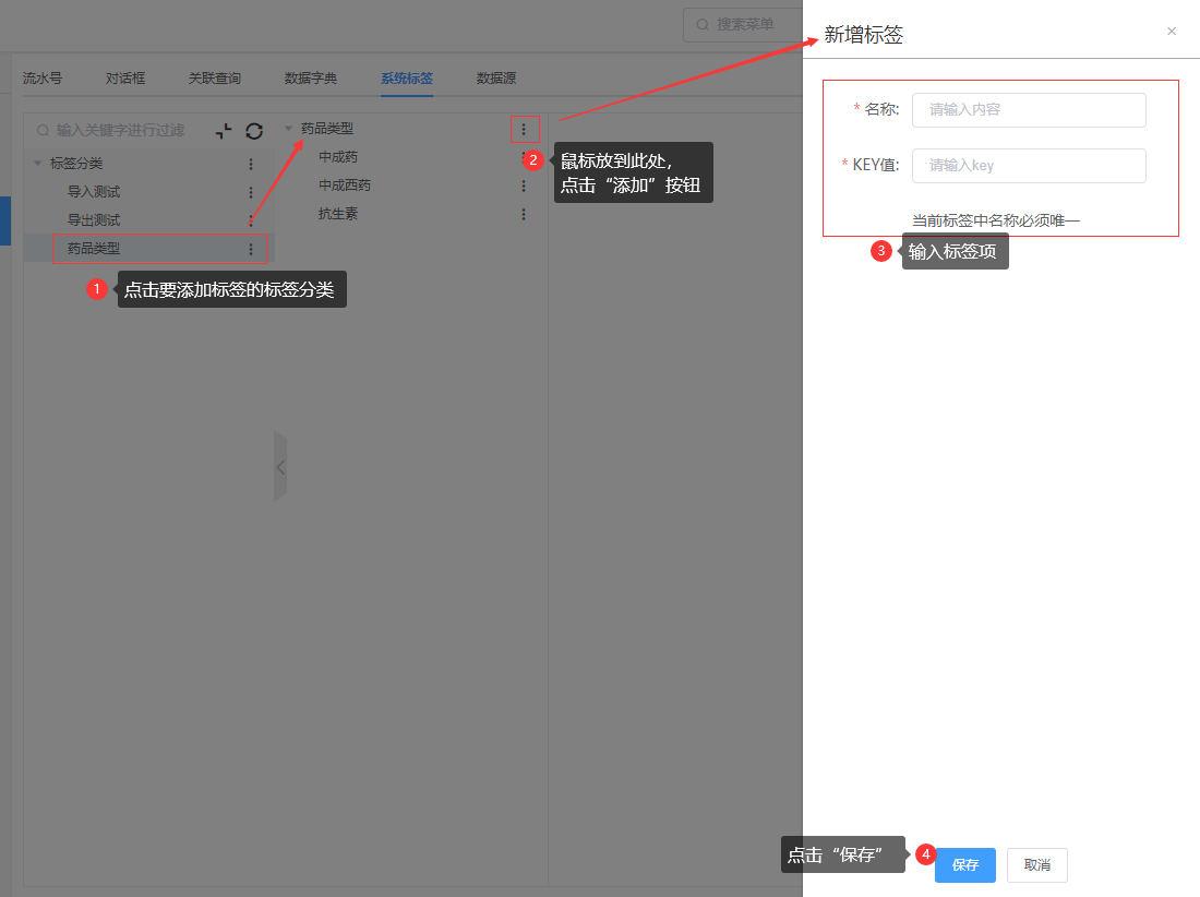 第五步:在右侧标签分类中点击“添加”,填写“名称”, “key值”;