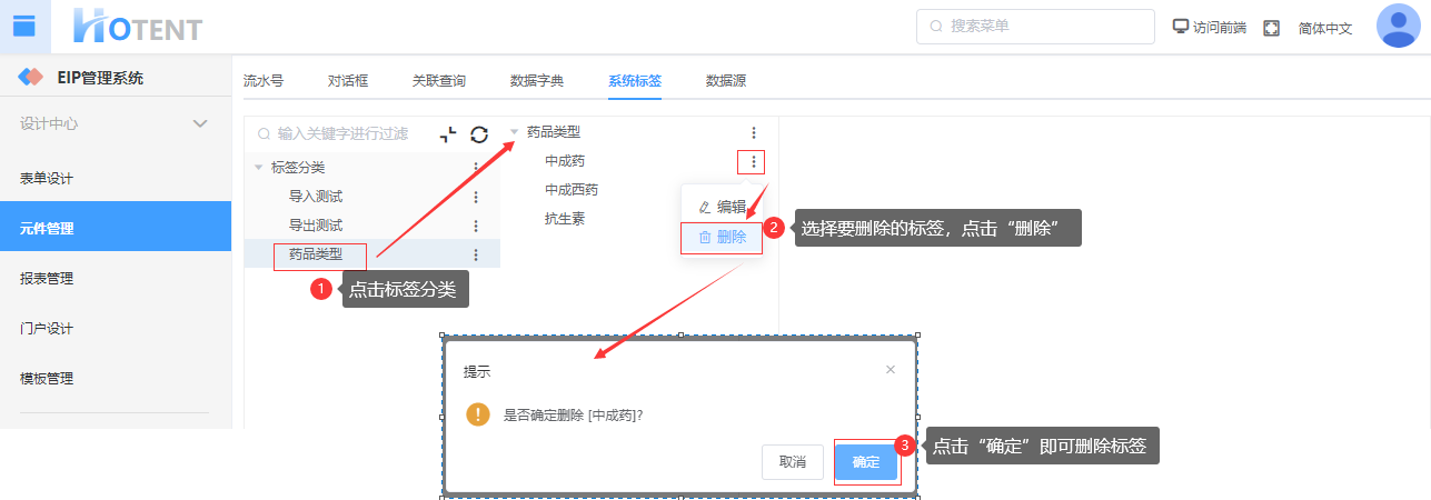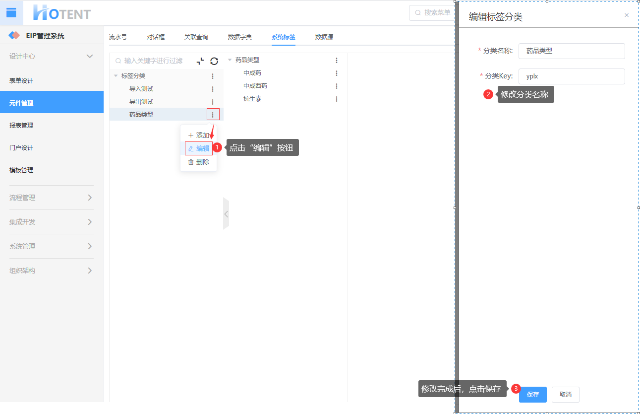 第一步:【设计中心】→【元件管理】→【系统标签】,选择要修改的分类,点击“编辑”;