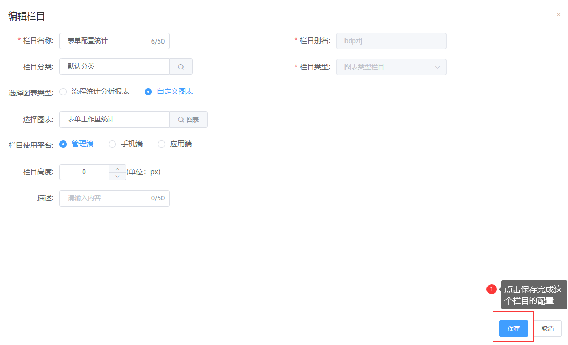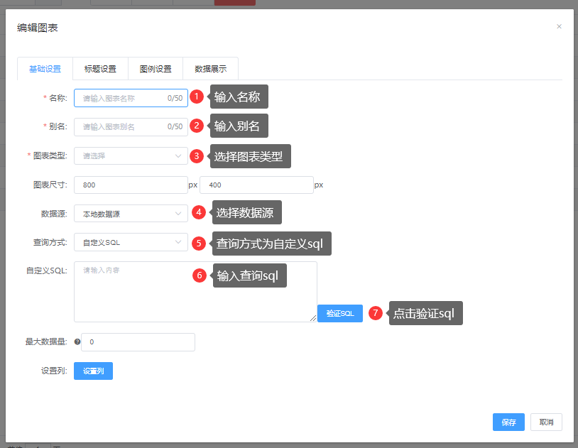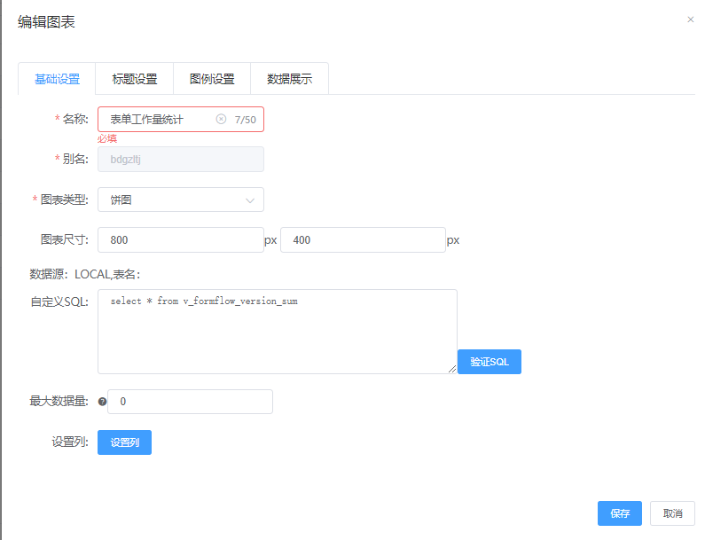 1、 名称:设置图表的名称(必填,填写名称后,别名会根据输入的名称首字母自动生成);