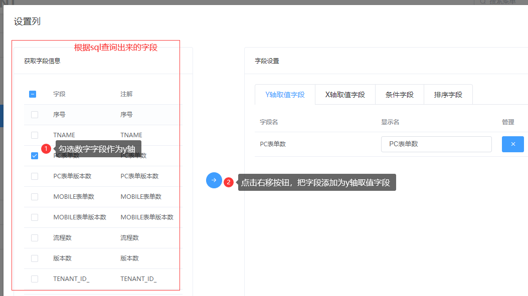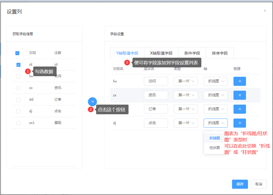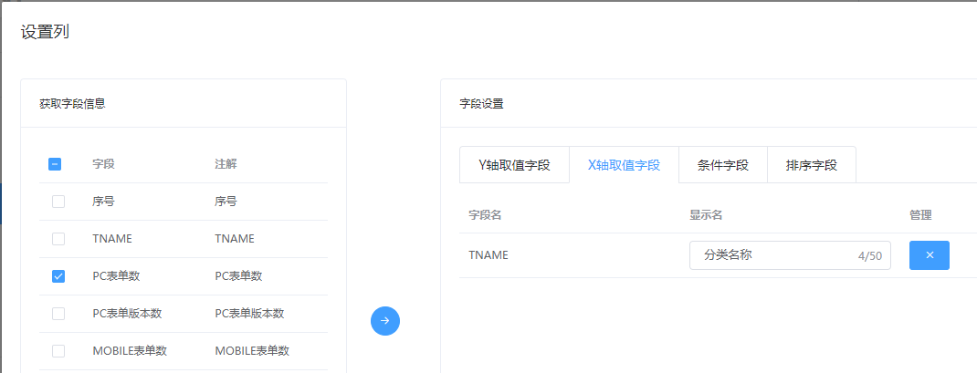 7、 设置列:设置图表的x/y轴的数据(选择表后,才能进行设置列);