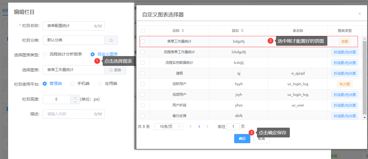 创建图表后,就可将该图表添加为首页栏目,并在首页布局中展示;