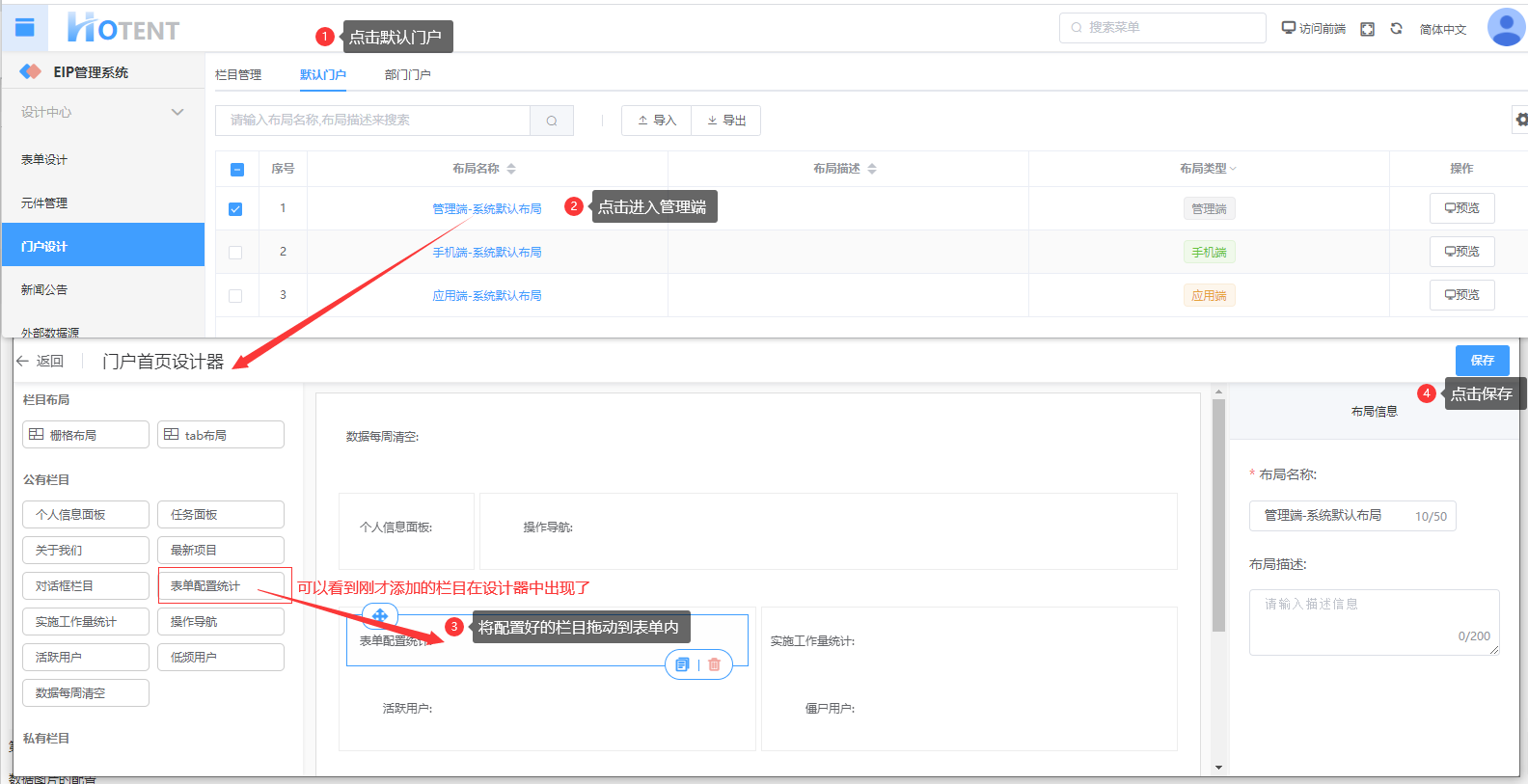 第七步:点击右侧的【默认门户】→【管理端-系统默认布局】,在门户首页设计器中可以看到之前添加好的栏目,把栏目拖入表单中,点击保存退出设计页面
