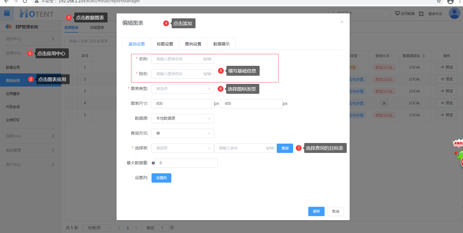 第一步:【应用中心】→【图表应用】→【数据图表】,单击“添加”;