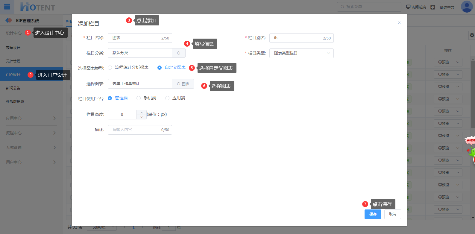 第六步:点击【设计中心】→【门户设计】→【栏目管理】,添加一个管理端的栏目用来展示这个饼图