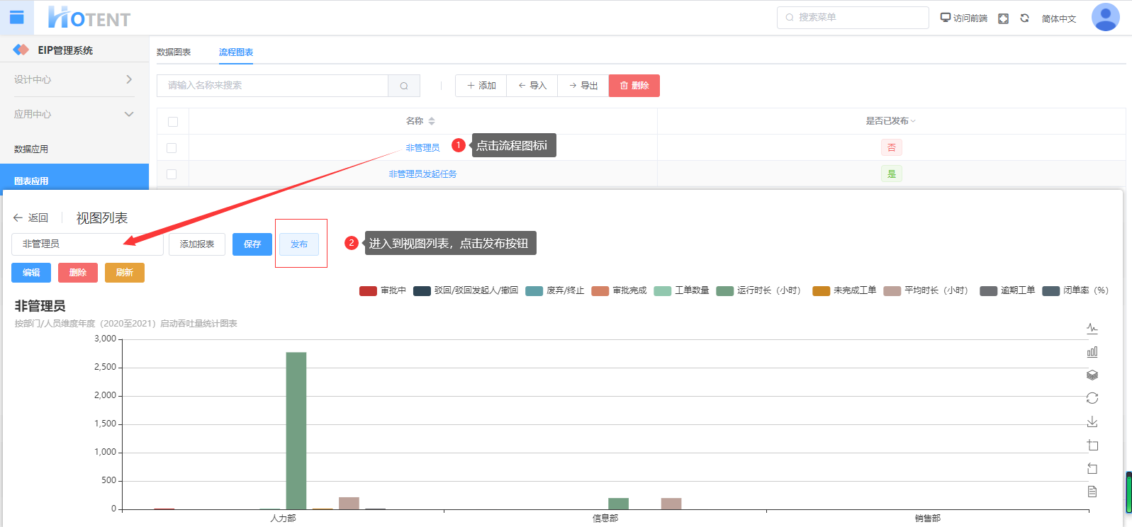 使用场景:配置一个流程报表用来统计三个部门发起流程,处理流程的任务吞吐量,并将这个图表展示到管理端首页上