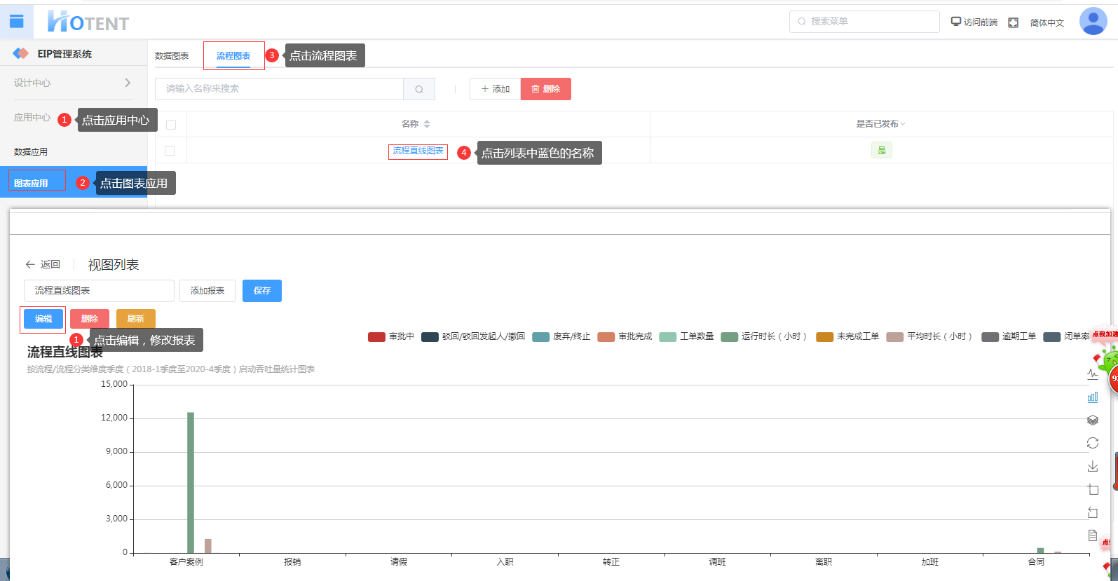第一步:【应用中心】→【数据列表】→【流程图表】,点击要编辑的列表名称分类;