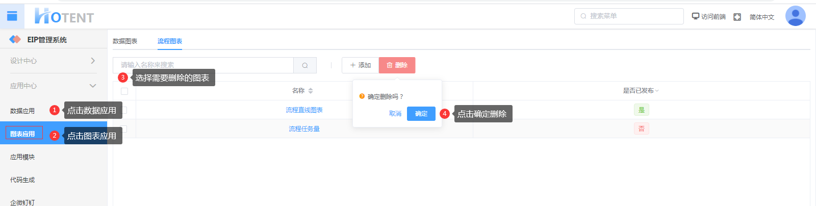 第一步:【应用中心】→【图表应用】→【流程图表】,单击“添加”;