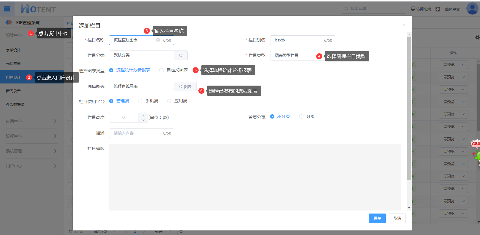 第三步:将该流程报表添加为栏目并把该栏目配置到管理端的首页上