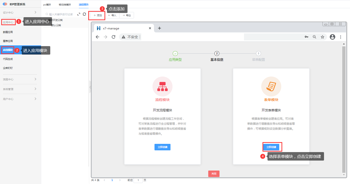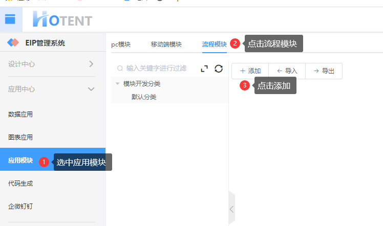 第一步:进入【应用中心】→【应用模块】→【流程模块】,点击添加,新增一个流程模块